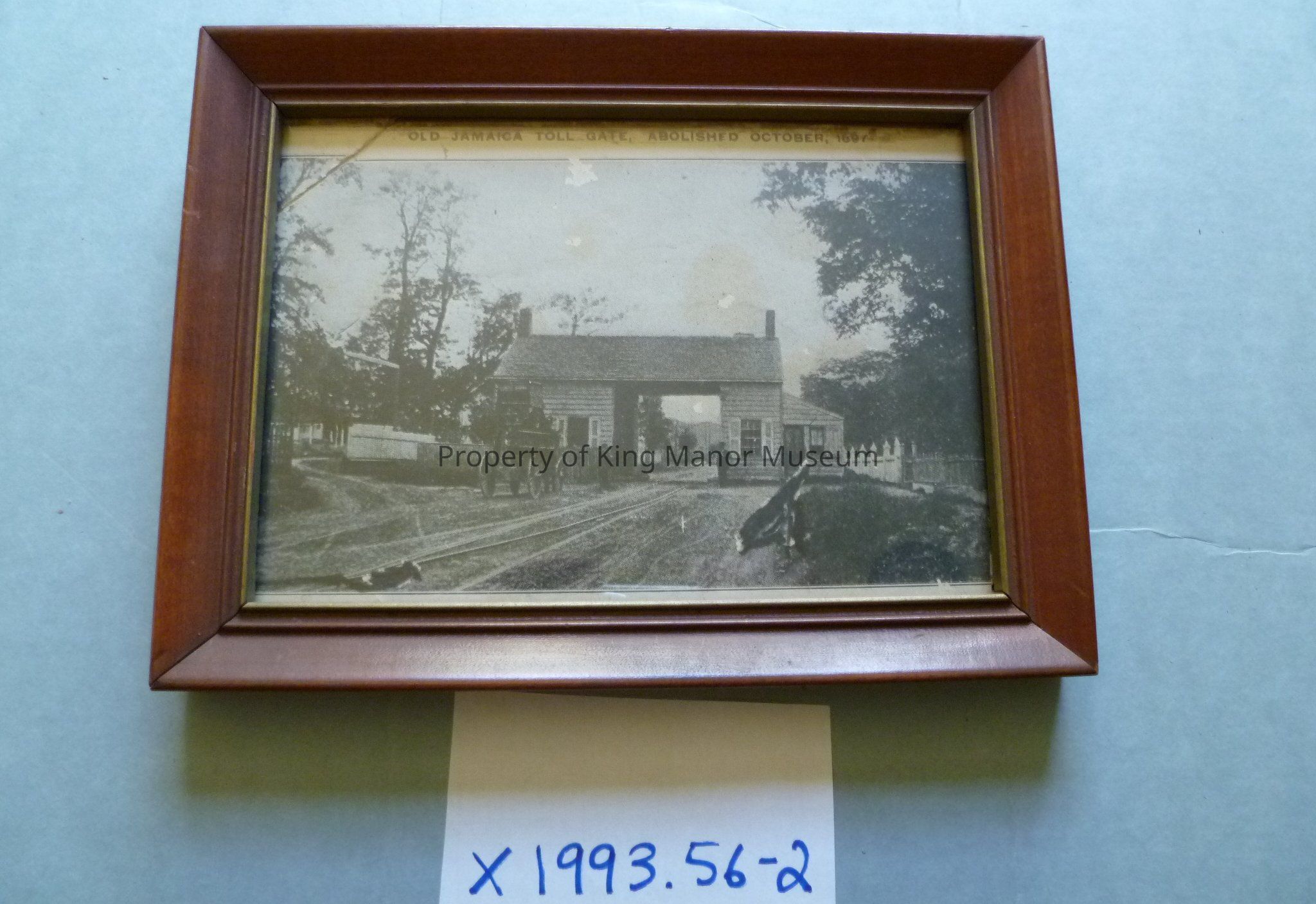 Print of the old Jamaica toll gate shown with 2 guards and a carriage in fron tof the gate. Written above the image is "Old Jamaica Toll Gate Abolished October 1897" Attached paper label "Mus Item 6 V Ba"