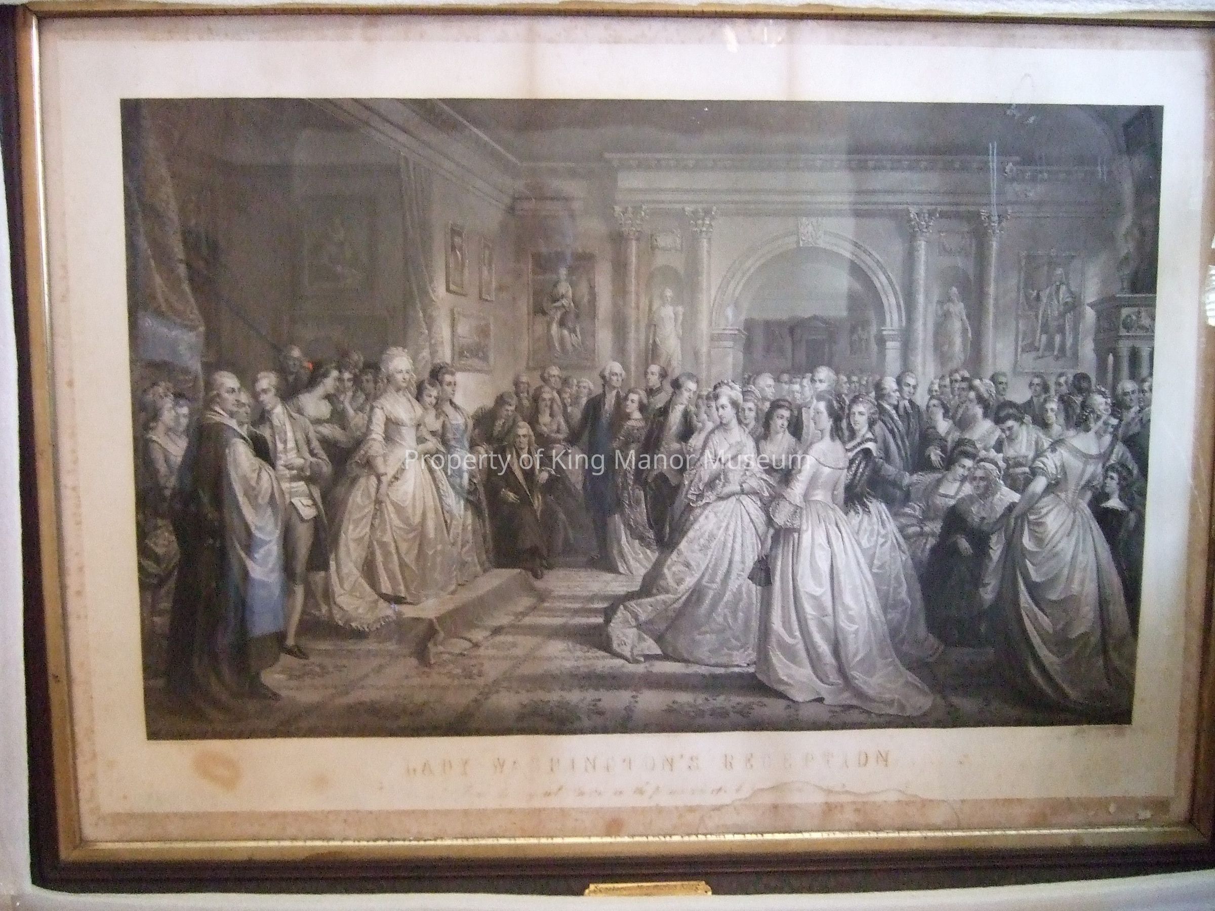 Engraved print titled "Lady Washington's Reception" featuring numerous figures in a large hall, their attention fixed on a woman on a platform at left; print is framed in a black painted wood frame having gold wood inner strip; the frame holds engraving titled, "Lady Washington's Reception"; the frame bears the plaque inscribed, "Senator and Mrs. Rufus King at Martha Washington's Reception"Collection