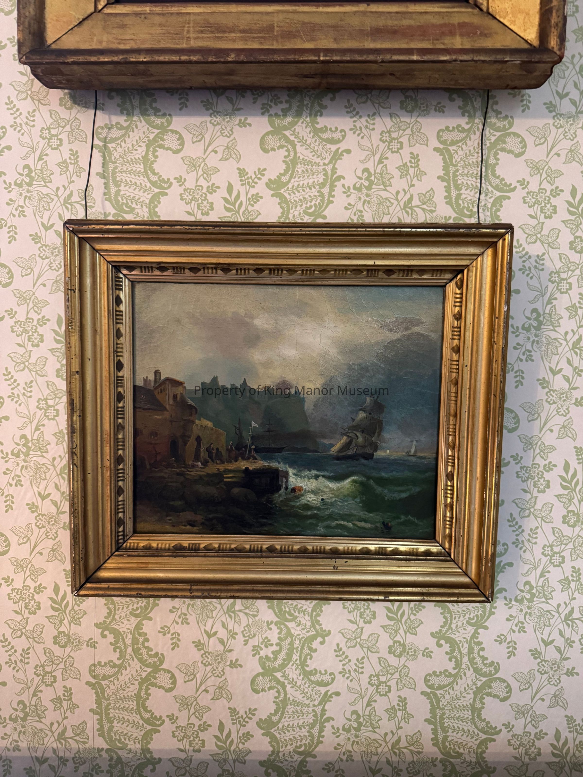 landscape painting of ship with castle in the distance by unknown painter. Not orginal to King Manor house or King family, meant to be used as historically accurate prop for Victorian parlor.Collection