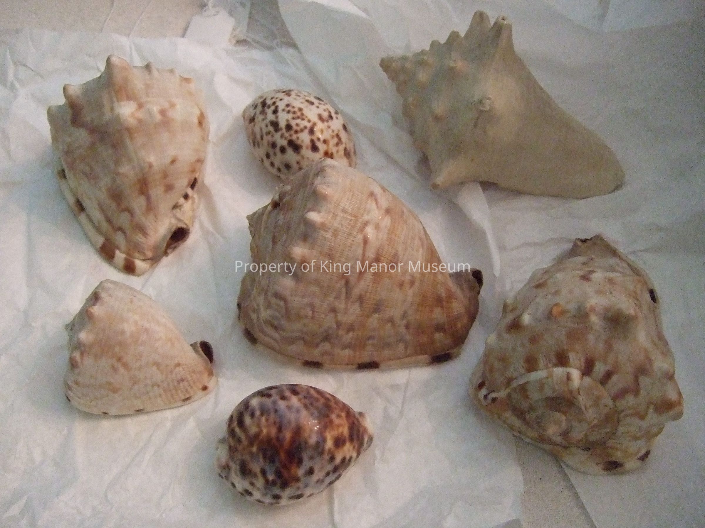Set of 7 seashells. KMA tag typewritten information: "Shells brought from South/Sea Islands by James E. Spice,/when as a young man he traveled/on whaling voyages./Given by his granddaughter/Miss V.C. Purdy"