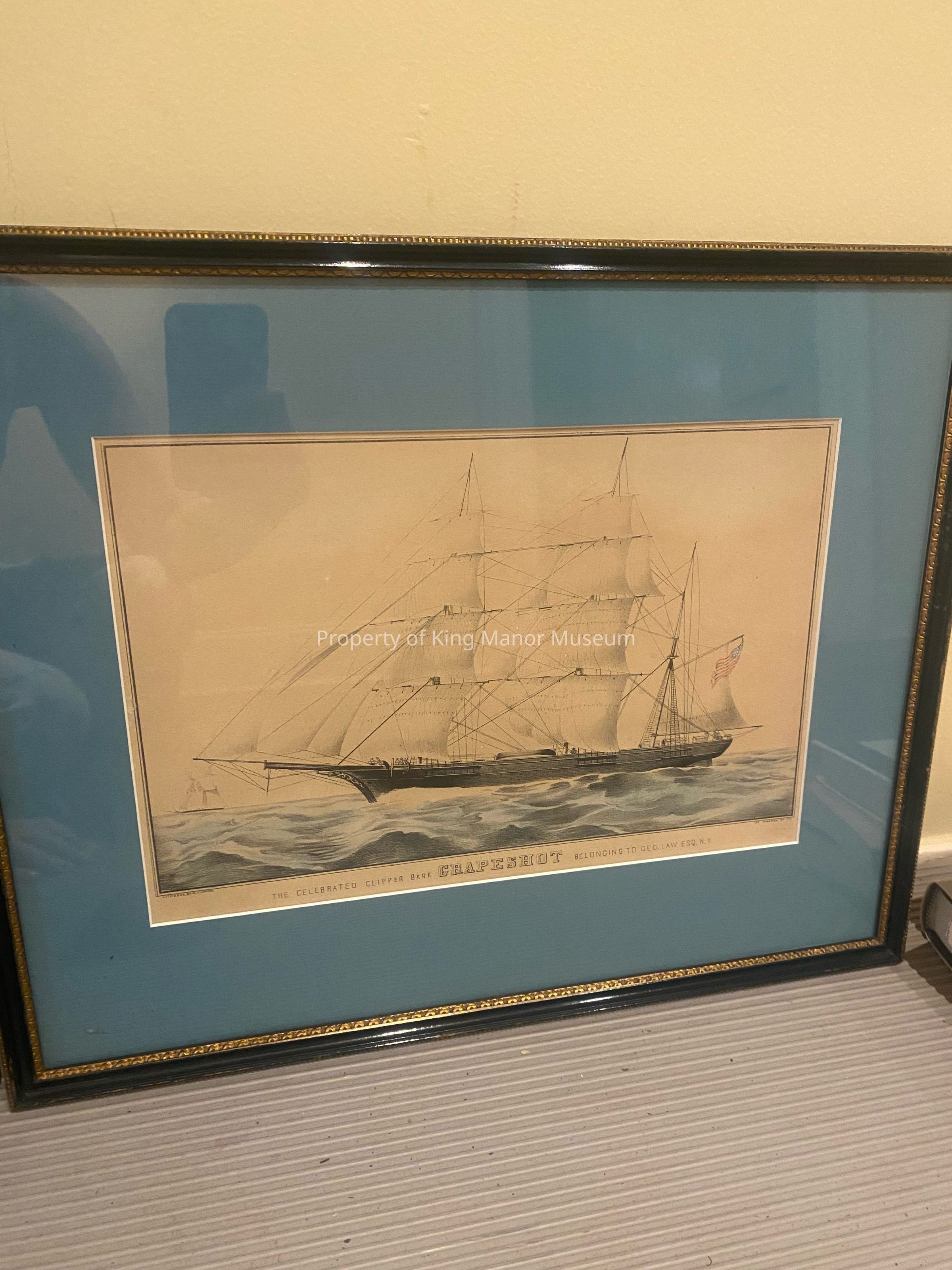 Engraving of ship “The celebrated Clipper Bark Crapeshot belonging to G.E.O, Esq. NY”