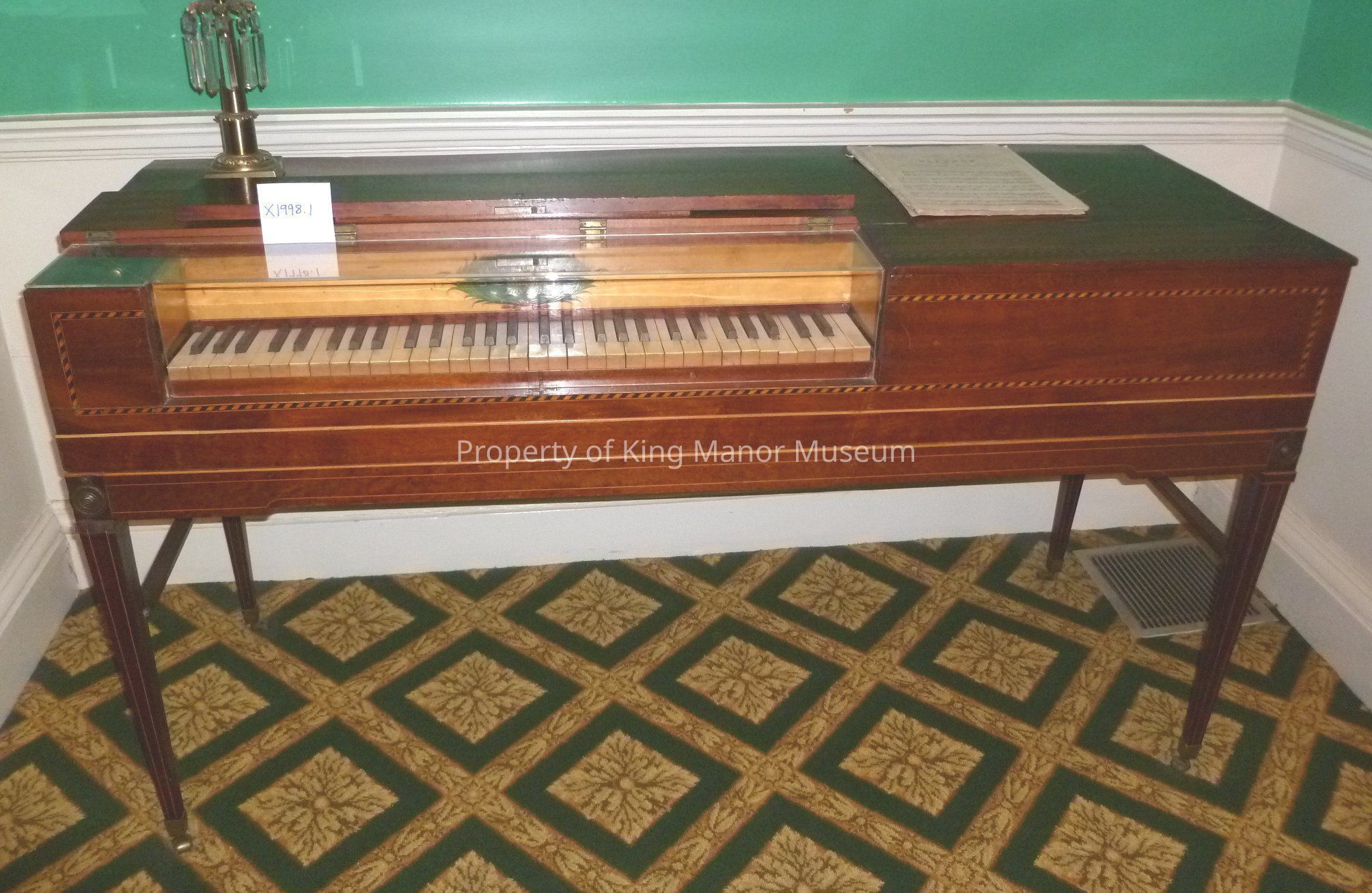 pianoforte made primarily of mahogany with fruitwood inlay. Four tapered legs, typical of the Federal/Regency style. Lever damper. Label reads: Longman, Clementi & Co. Cheapside London.Collection