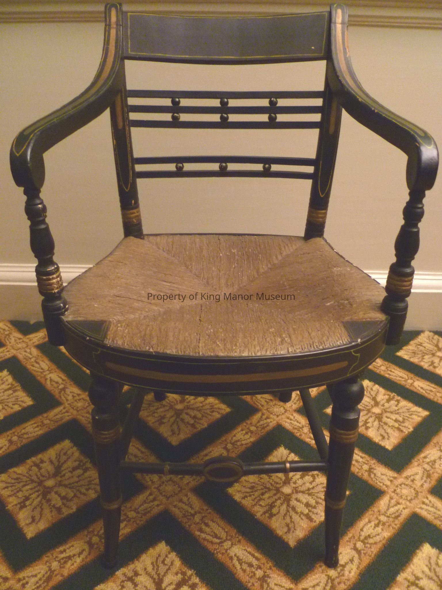 Fancy arm chair with ebonized finish and gold banding, and straw seat. (Straw was coated with a substance in order to harden). Back has a set of horizontal splats, the upper consisting of three narrow splats, which have three balls in between a pair of splats, totalling six balls. The lower consists of only two narrow splats with only three balls between them. Curved arms, ornately turned forelegs and forearms. Simple double spindle stretcher on sides and single spindle stretchers on front and back; the front is worked with an oval in the center.Collection