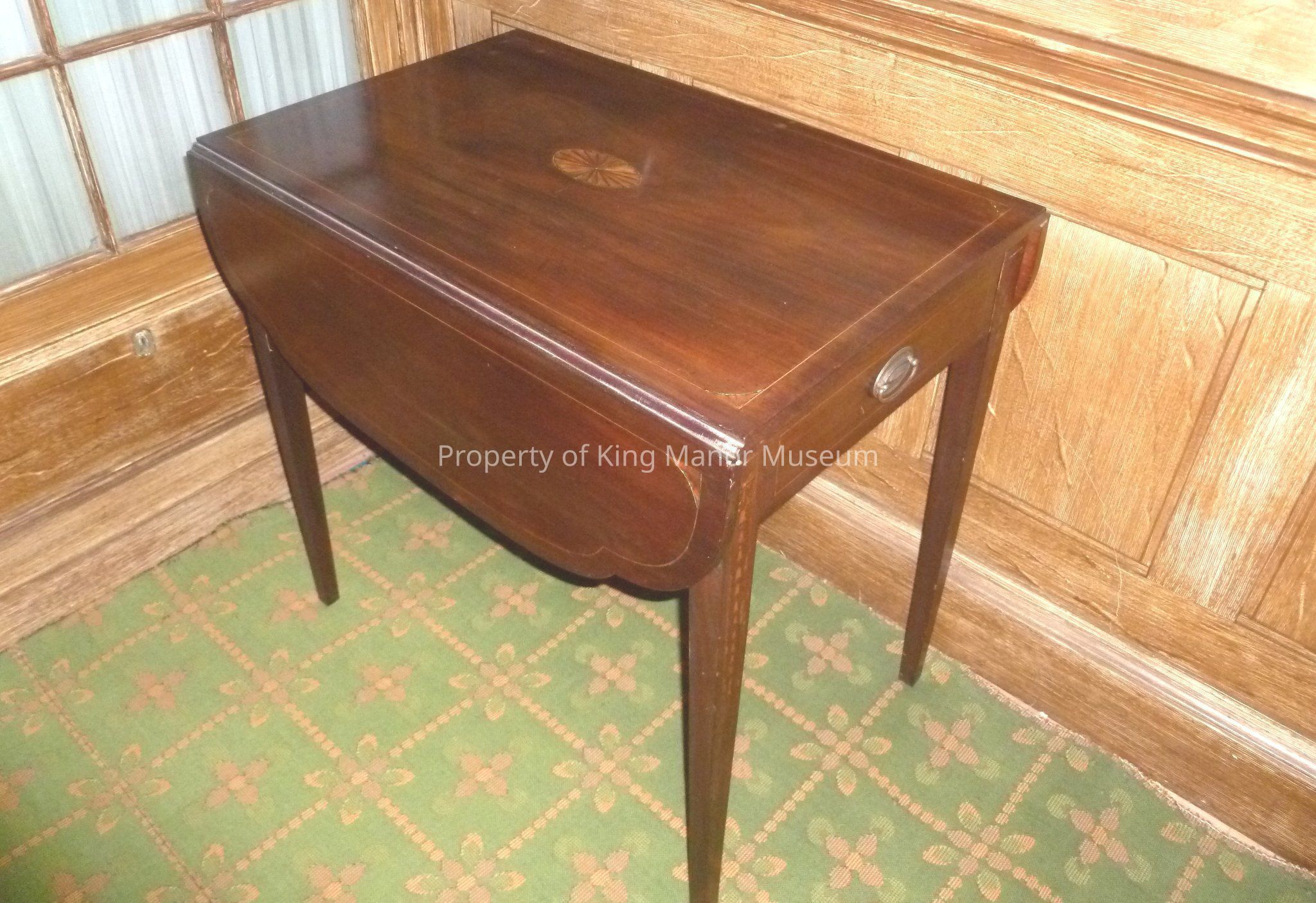 Breakfast table of wood and veneer with linear and point paterae inlays, at center of table as well as on corners. Drop-leafs have curved/rounded edges, with linear inlay. Simple, tapered legs with bow, bell flowers and pellet-drops inlay, stops half way down the legs. Two oval shaped, brass pulls on both working drawer and faux drawer.Collection