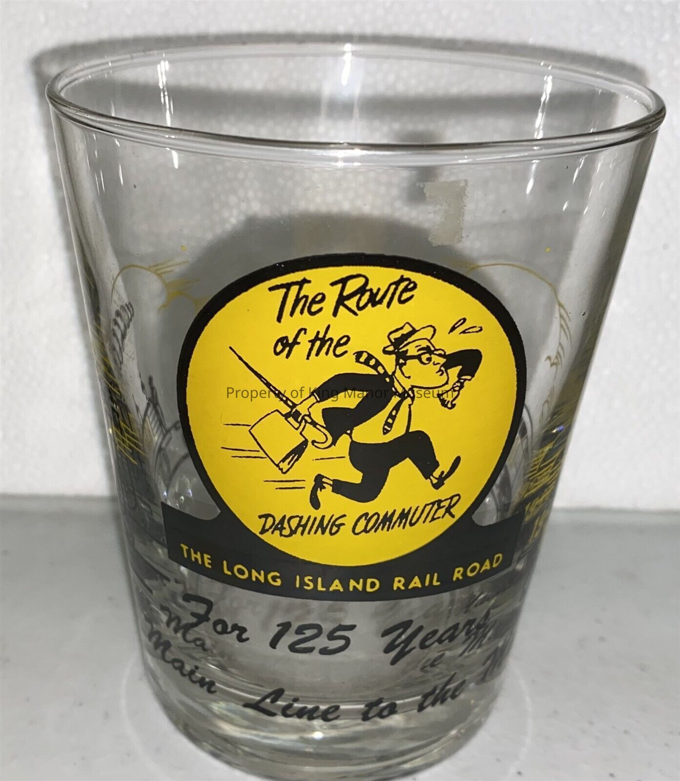 highball glass for celebration of 125 anniversary of Long Island Railroad featuring an image of a cartoon with a man rushing to work with "The Route of the Dashing Commuter" written, 1959Exhibition