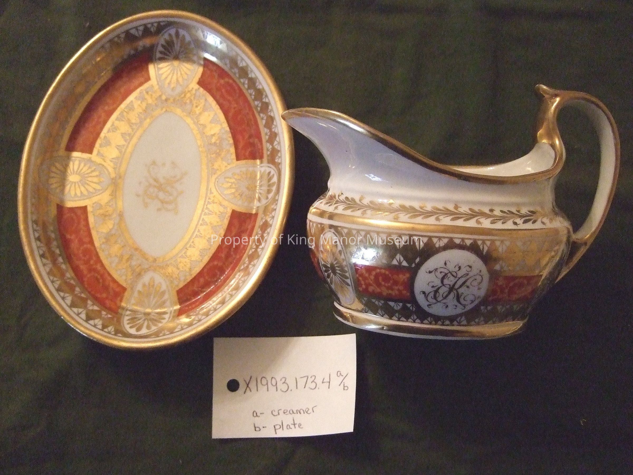 Porcelain creamer and plate with matching gilded and iron red, neoclassical decoration as on x1993.173.1 A,B. Body of creamer has central medallion with gilded monogrammed "EK" flanked by medallions with gilded floral design.