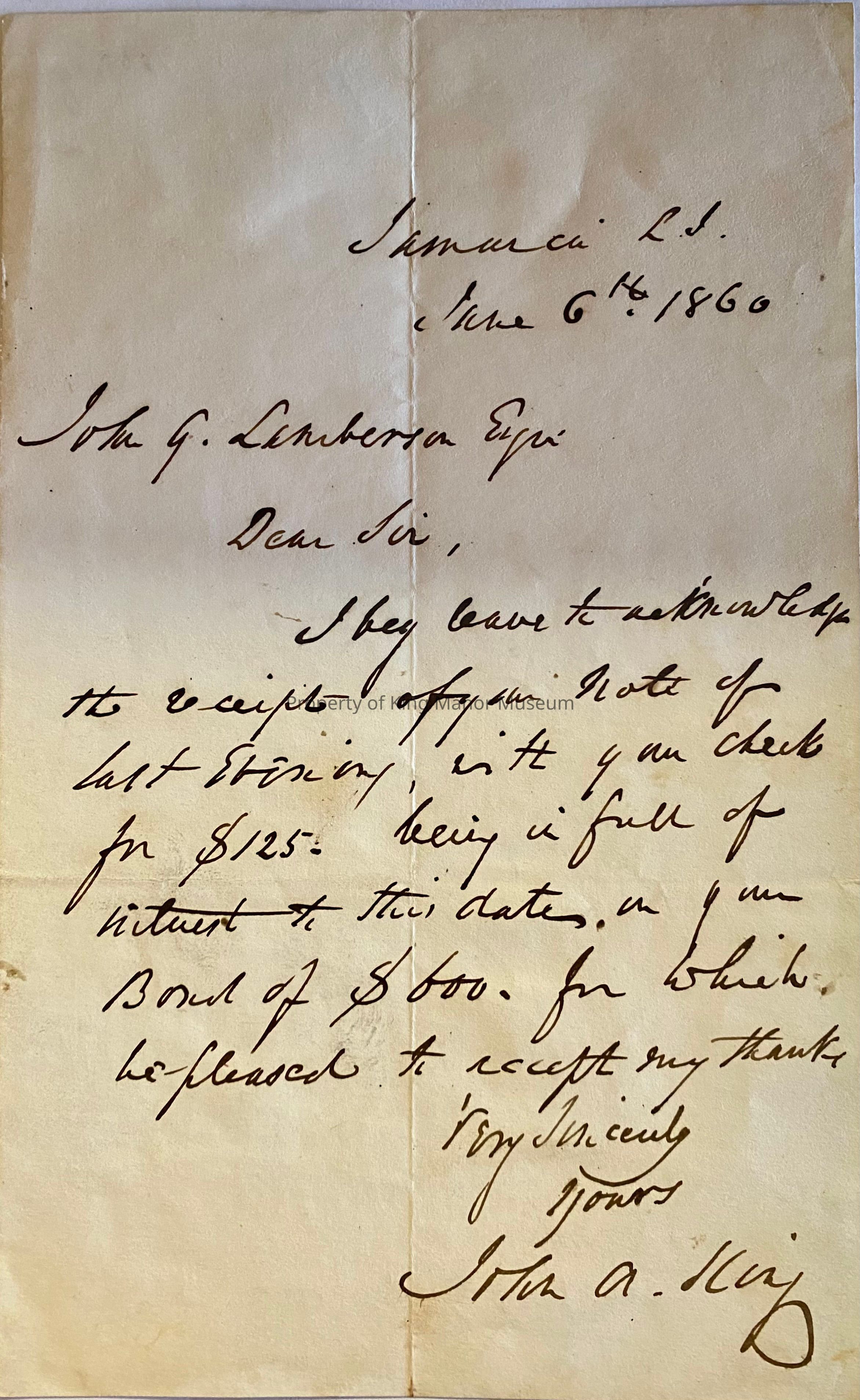 Letter from John A King to John G. Lamberson Esqr. thanking him for sending a check of 125 dollars dated June 6th, 1860Collection