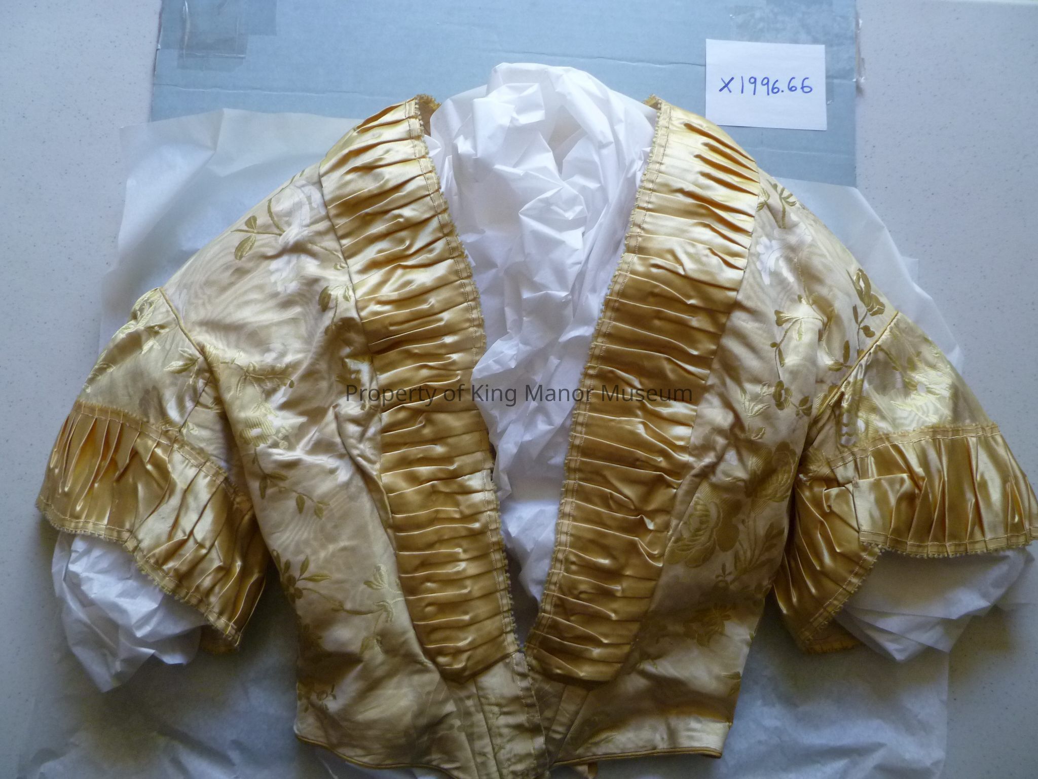 c. 1850s Gold silk bodice, boned and fitted, having plunging V-neck to waist, short, dropped sleeves, the neckline decorated with band of tucked gold silkCollection