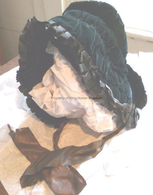Green velvet bonnet having box pleated ribbon trim decorated ruffled visor, silk satin ribbon ties at chin and blue velvet ruffle at base of neckCollection