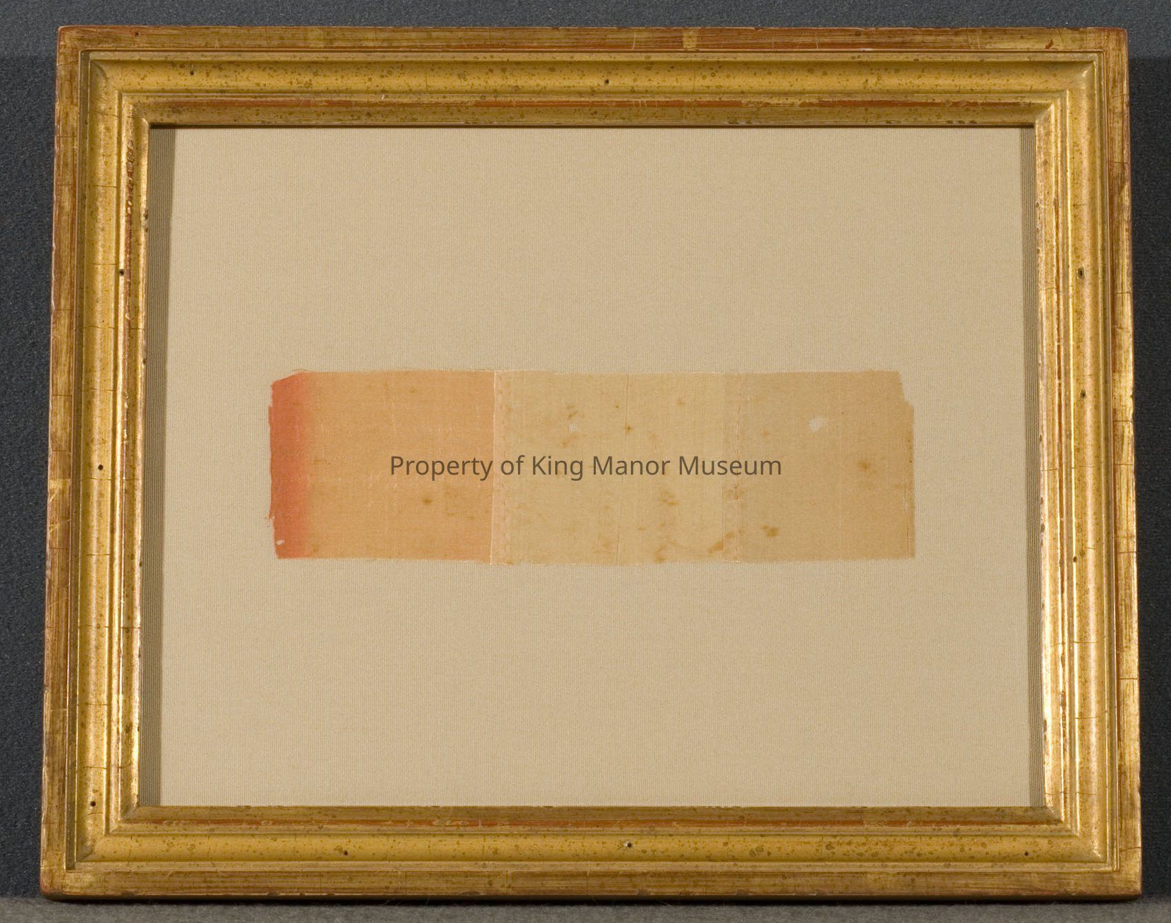 Small, silk fragment of sash worn by General LaFayette on his visit to America in 1824. The sash was given to Eliza Gracie King Halsey. Ribbon is in small wooden frame covered with glass. Original color was blue/white/red. Each color of ribbon was sewn together.Collection