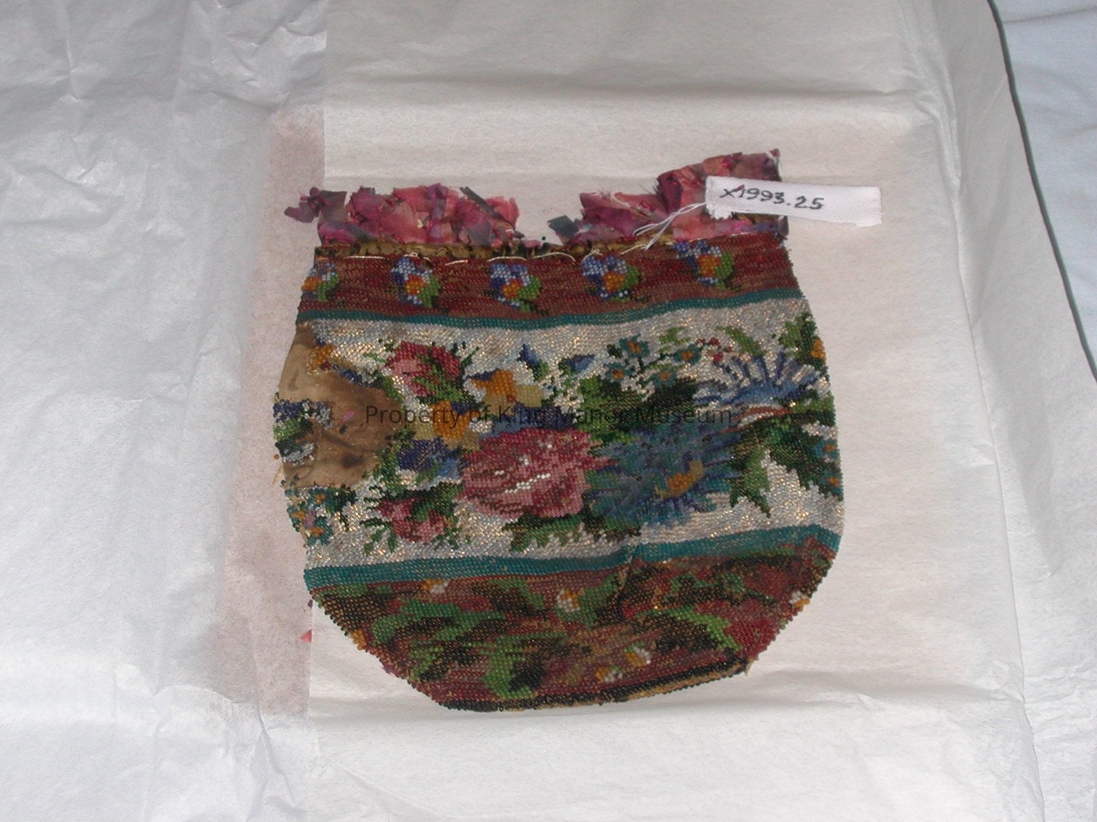 Small purse with beaded floral design and silk trim at opening. Made by Esther Gracie King (Charles King's daughter, Rufus' grand-daughter)