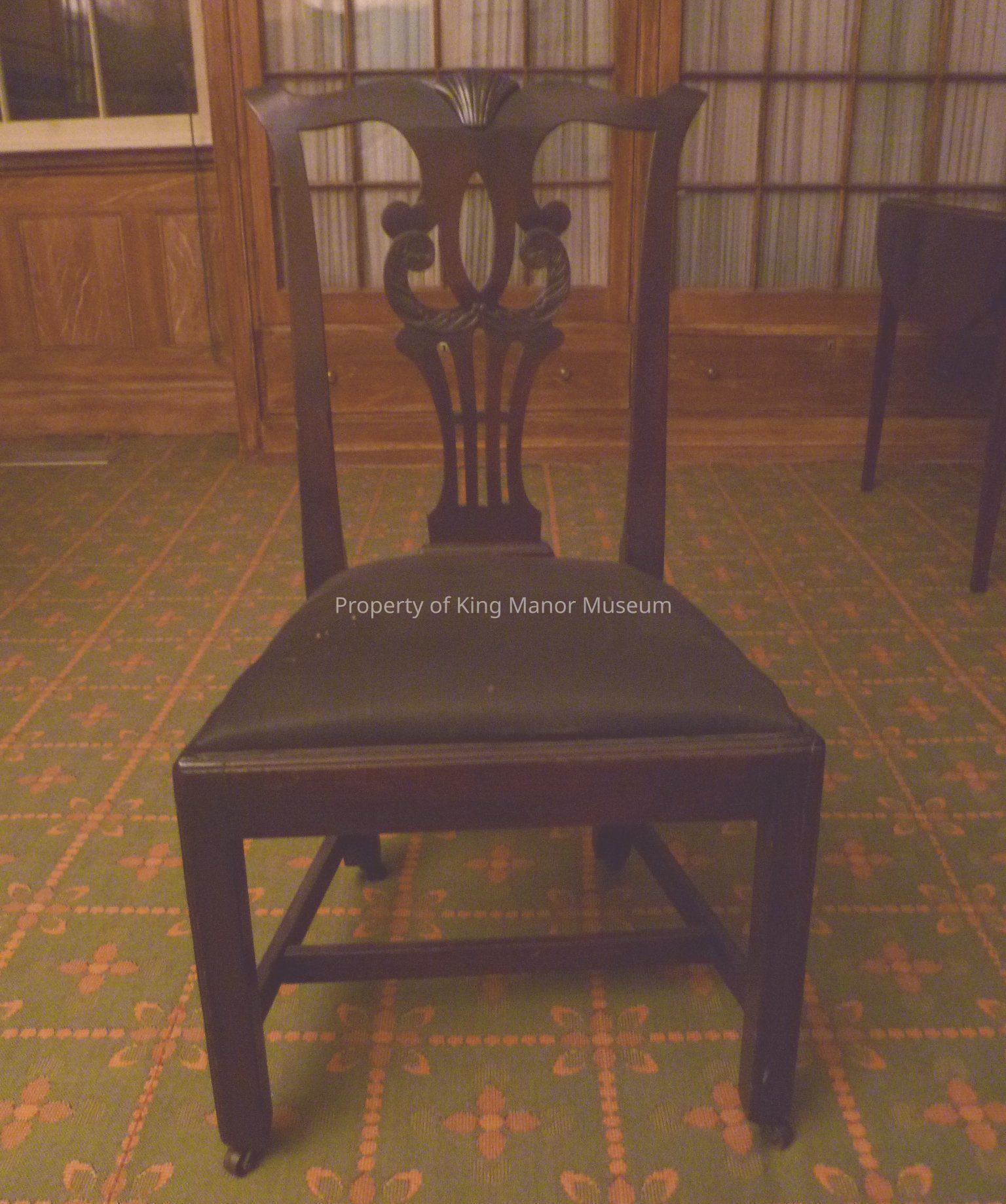 Desk chair with frame in the Chippendale style. A carved shell center is on the crest of the rail. Black, horsehair slip seat cover. Simple/undecorated legs and spindles with four small wheels.Collection