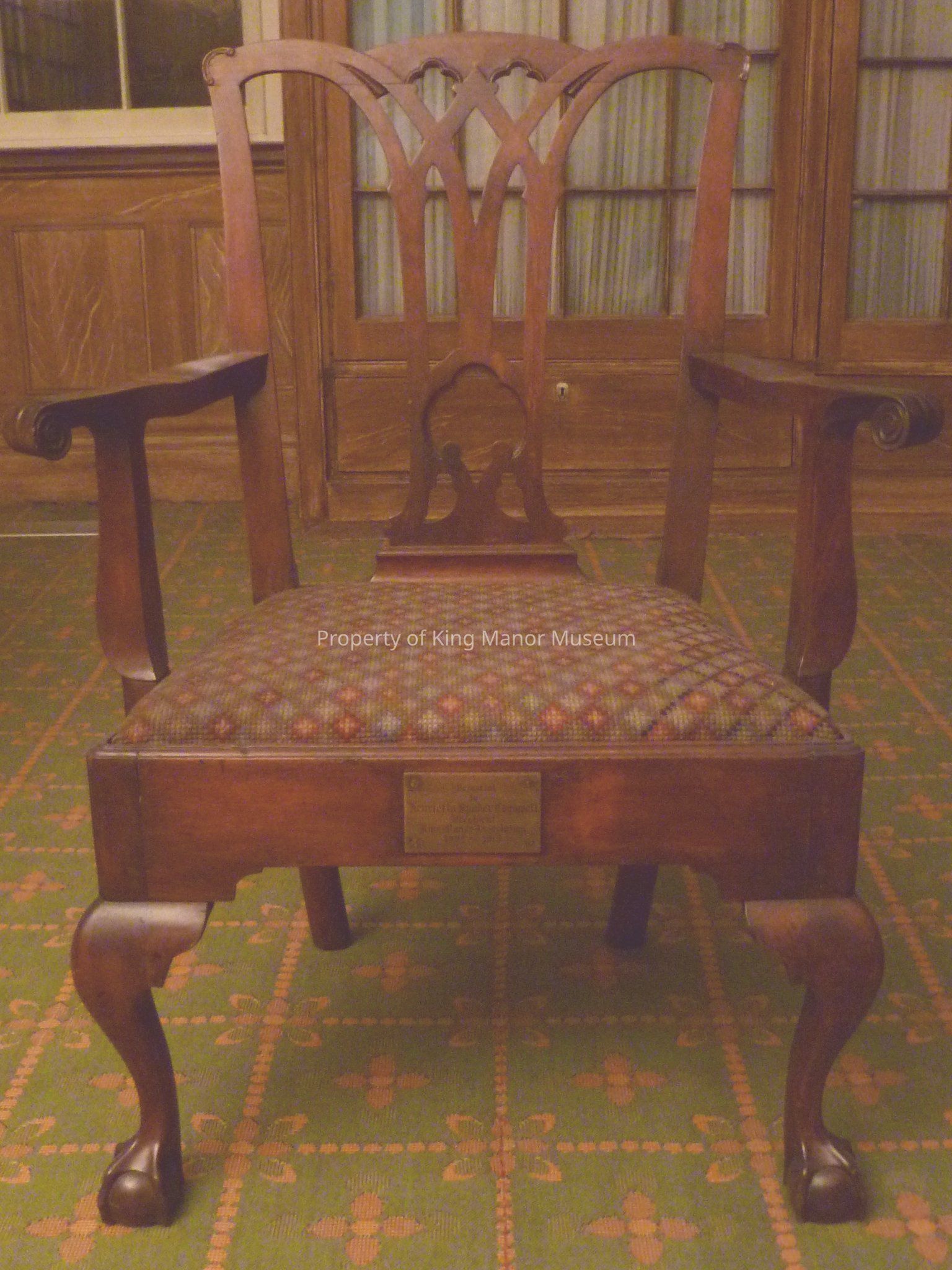 Arm chair in Colonial Revival style with needlework slip seat cover. Arms have curved edges.