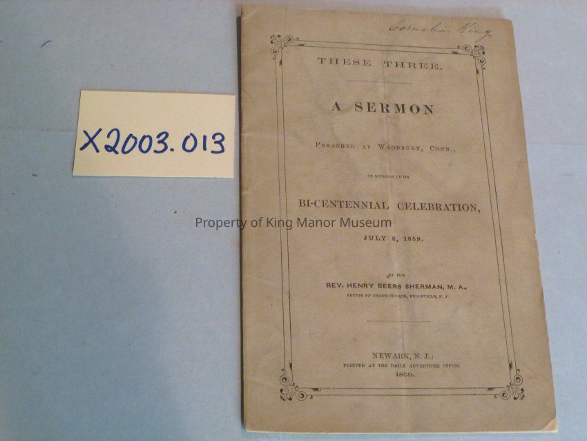 Small paper pamphlet; 18 pages long. Sermon for bicentennial of Woodbury, CT. Front and back cover have inscription "Cornelia King."Collection