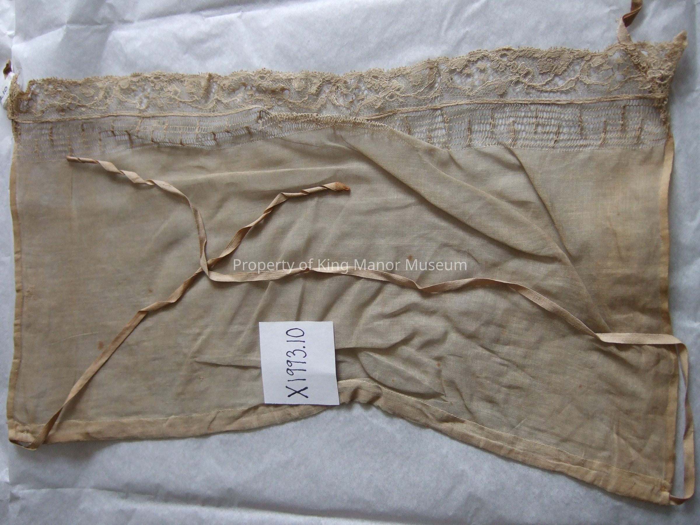 Handstitched white lawn cap, rectangular with slip sleeve and twill draw cord on one long side and lace trim and cutwork border on other long side.Collection