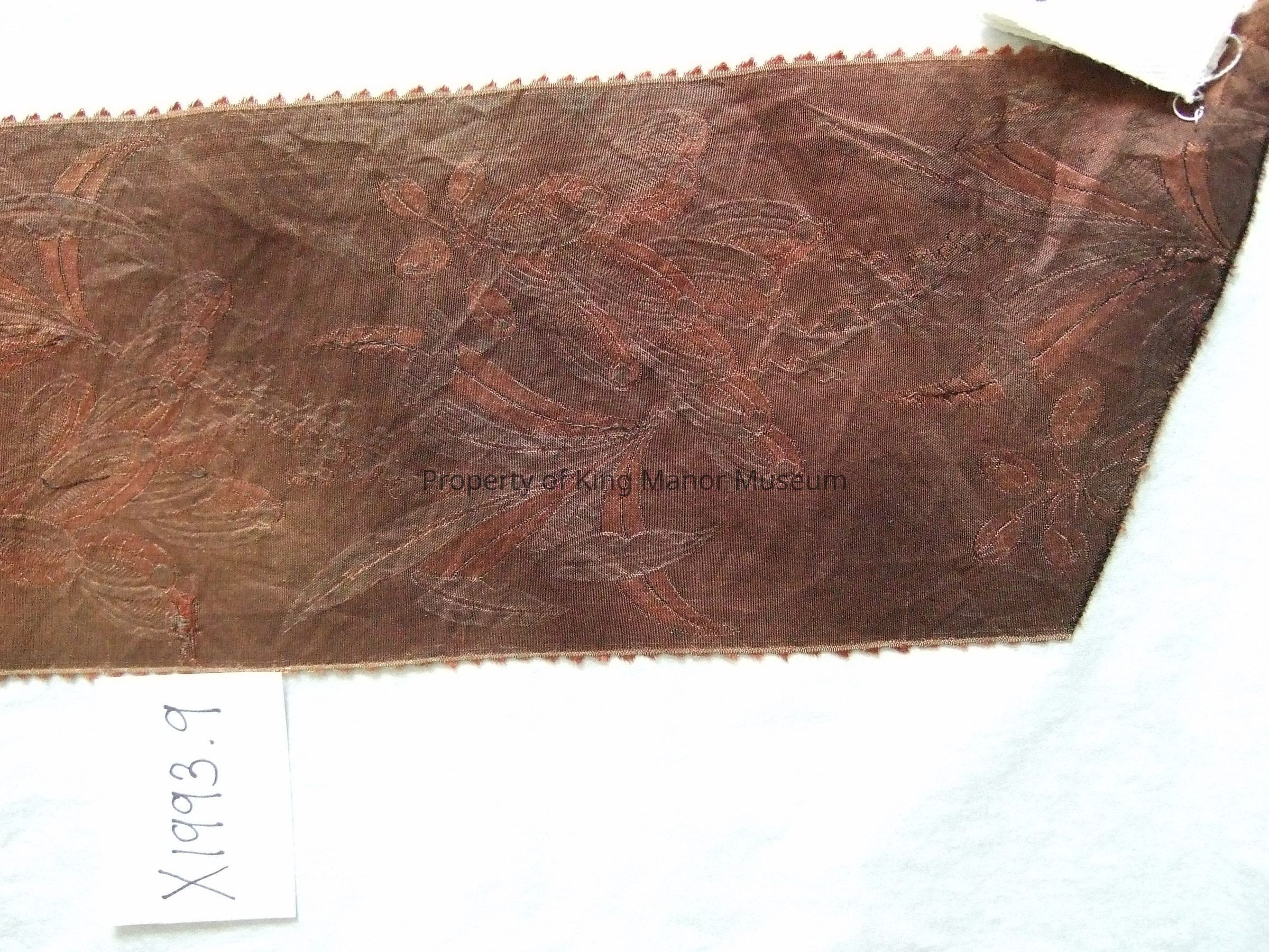 Faded silk textile, brocaded. Possibly a sash or border; faded to brown; possibly traces of red. Narrow pattern appears to be dress fabric.Collection
