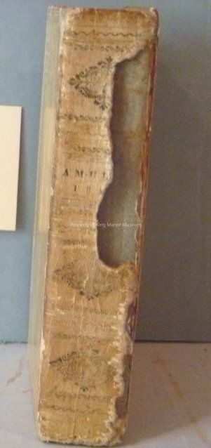 Small book with prints scattered throughout book and gold trimmed edges. Pale yellow leather cover with gold floral trim embossed all around edges. Inscription on first page says "Eliza G. King from Cornelius Low, December 18 1826." Eliza also signed her name beneath the inscription.Collection