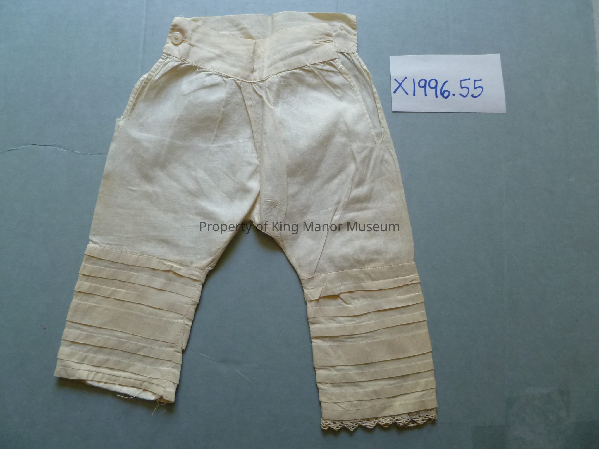 Off-white cotton drawers for doll having tucks on legs, lace on hem, and side button closure