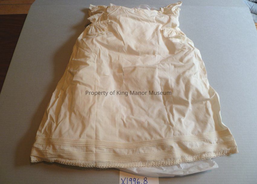 White cotton infants or childs dress of A-line styling having square neck with drawstring, cap sleeves and ruffled front pocketsCollection