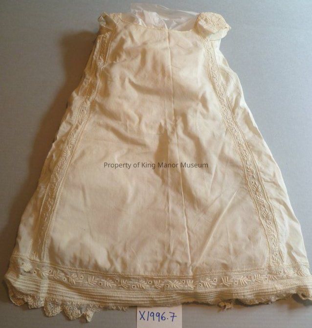 White cotton infant or child's dress of A-line styling having drawstring at square neckline, cap sleeves and dcorations of embroidery, tucks and cutwork at sleeves and hemCollection