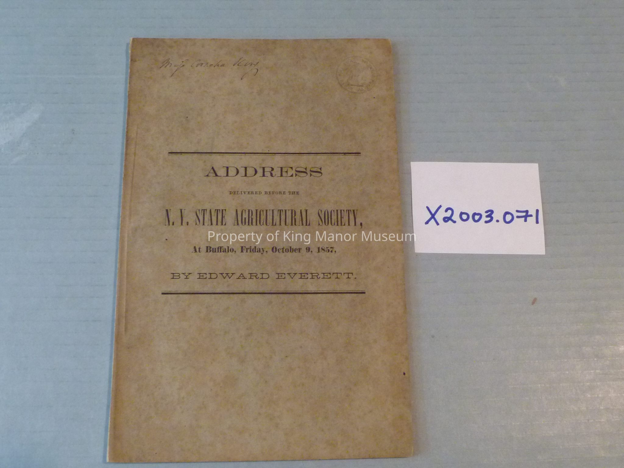 Small paperback of speech, 56 pages long. Inscription on cover says "Miss Cornelia King." Embossed stamp of N.Y. Agriculture Society on cover as well.Collection