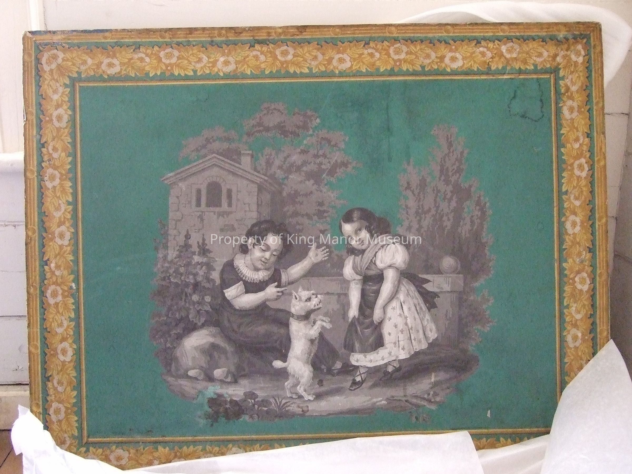 Large, rectangular shaped fireboard. There is a single wallpaper border around the edge depicting golden leaves with white flowers. In the center are two young children, a boy and a girl playing with a dog. They are outside by a low wall with rocks, flowers, trees, plants and a building in the background, all of which are in different tones of grey and white. The rest of the screen is green. Back of fireboard has wooden X shaped frame.Collection