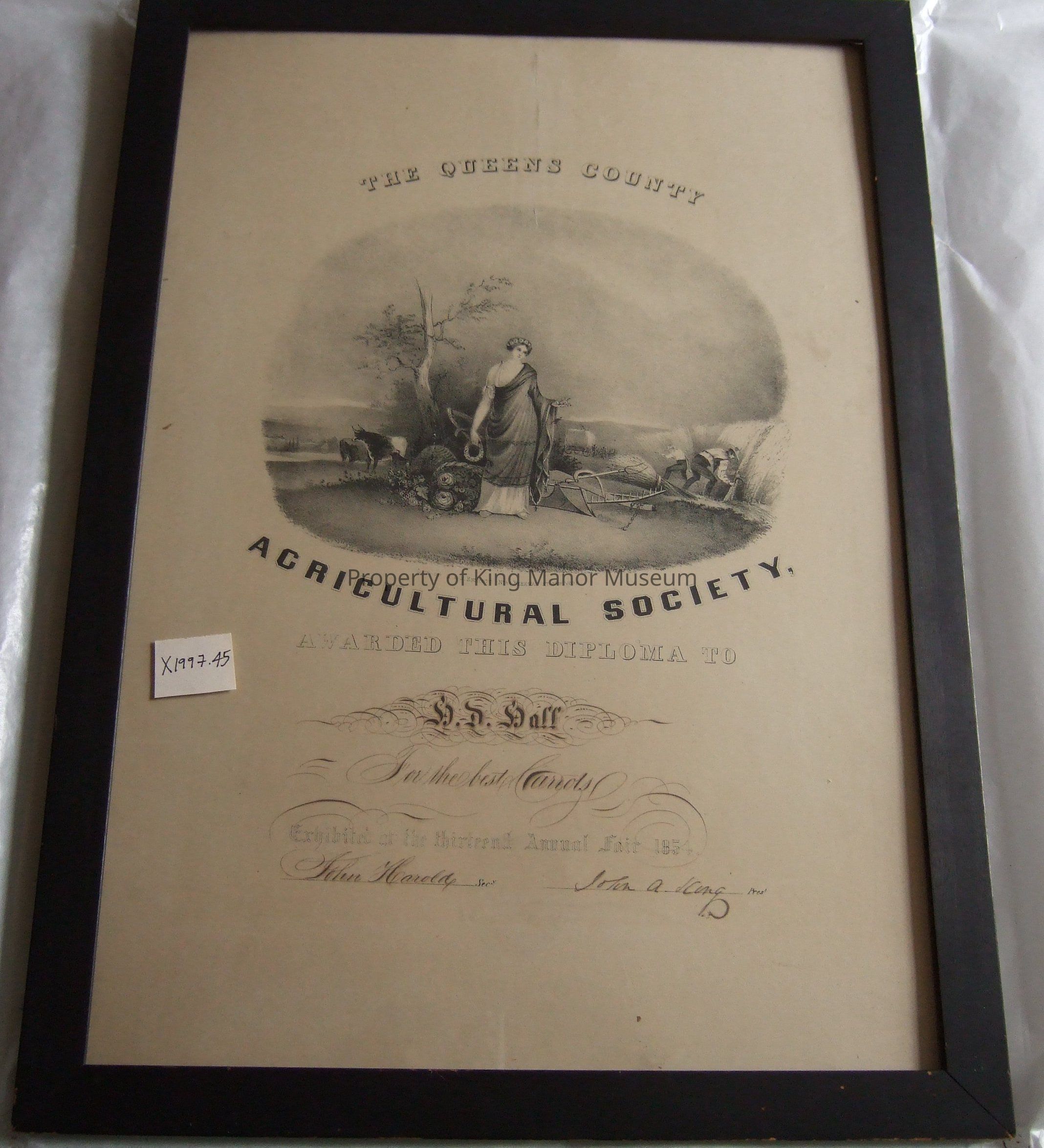 Paper diploma from "The Queens County Agricultural Society, Awarded this diploma to H.D. Hall for the best carrots exhibited at the thirteenth annual fair 1854." The diploma was signed by John Harold, Sec. and John A. King, Pres. which is currently framed.