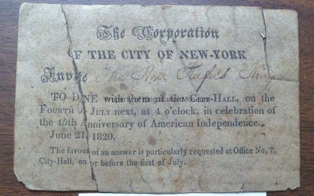 Paper board/cardboard invitation, engraved with pen and ink: "The Corporation OF THE CITY OF NEW-YORK Invites The Hon. Rufus King To Dine with them at the City-Hall, on the Fourth of July next, at 1 o'clock, in celebration of the 45th Anniversary of American Independence. June 21, 1820. The favour of an answer is particularly requested at Office No., 7, City-Hall, on or before the first of July."Collection