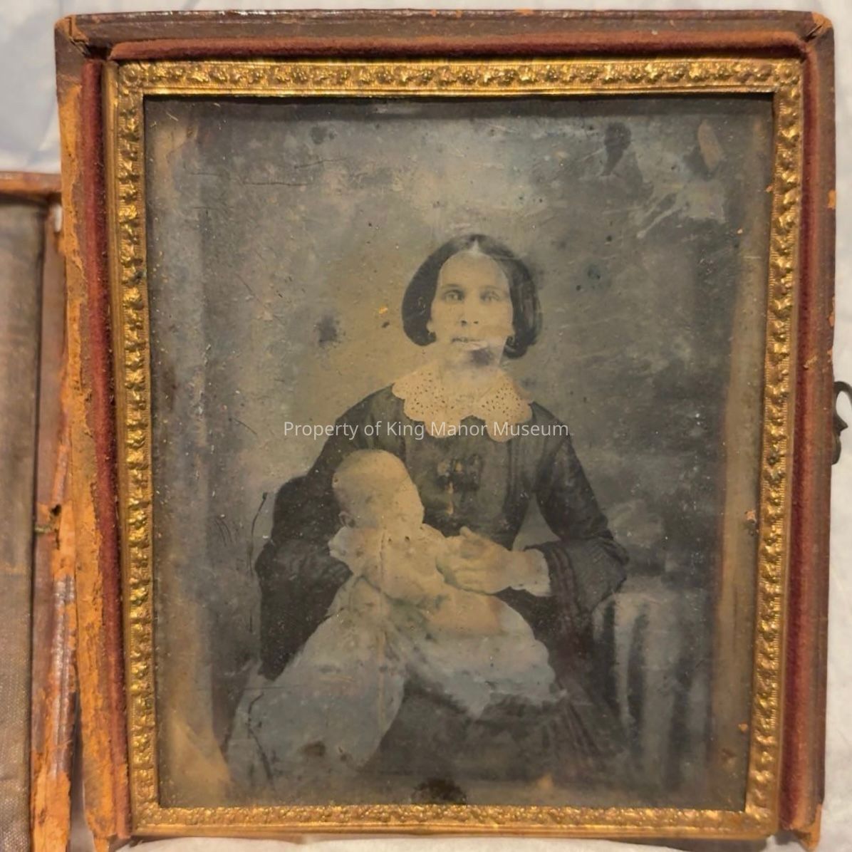 Daguerreotype bond on glass with brass(?) stamped moulding. Portrait of a woman holding a baby in her lap. She is wearing a dark, silk(?) dress with white eyelet collar. Her hair is very simply styled, being loosely puffed out at each side of her face. The case is covered with reddish/brown leather and embossed with a foliage motif.Collection