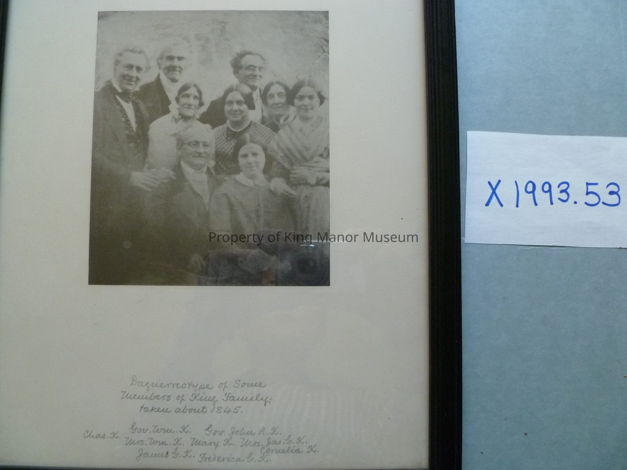 Photograph: Daguerreotype of a large group of the King family, framed under glass. All the members are smiling. They appear to be John A. King, William King, Charles King, and James Gore King. The women are Mrs. William King, Mary King, Cornelia King, Fredericka Gore King, and Mrs. Jas. G. King.