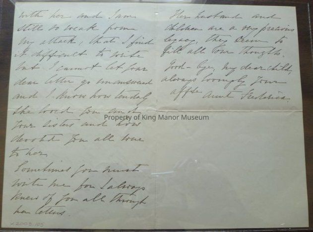 Letter written to Emily (Emily Sophia King?), dated August 4th, no year, from aunt Frederica (Frederica Gore King?).