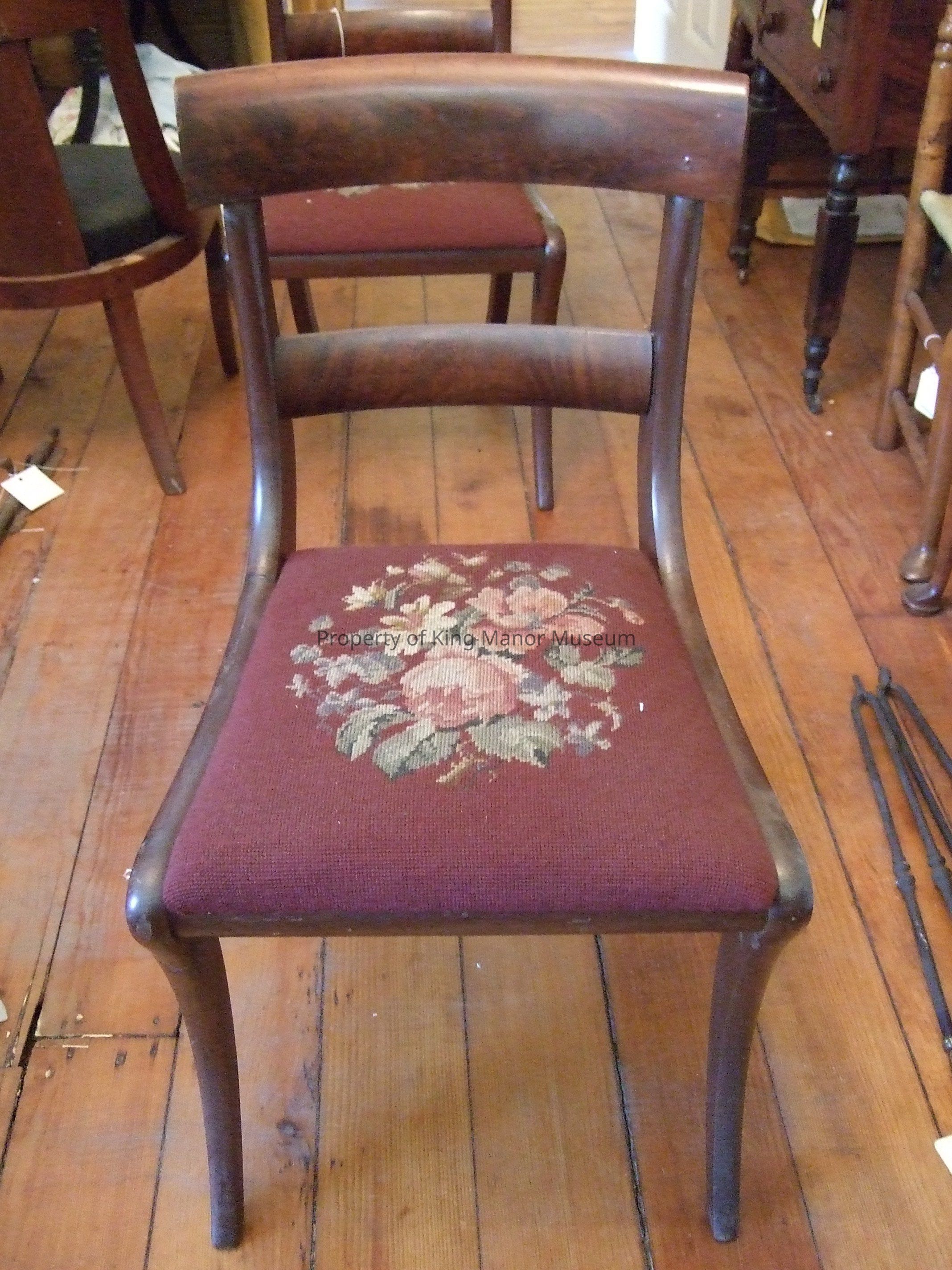 Klismos style side chair with saber legs, rectangular crest and rectangular, horizontal back splat. Seat cushion covered in needlepoint. Possibly owned by John Alsop King