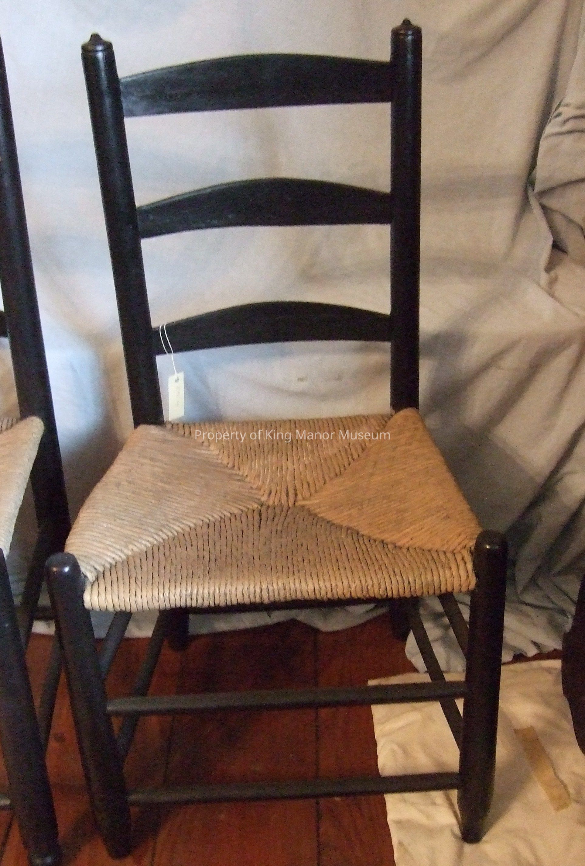 Ladderback side chair, acorn cap finials, wood painted black and painted rush seat. Double stretchers on front and sides.Collection