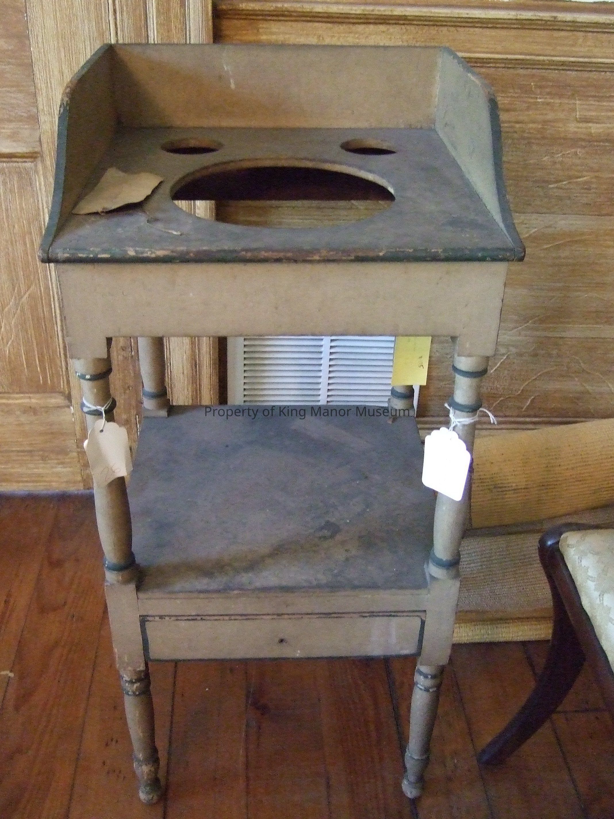 Painted washstand with lower shelf and drawer, missing knob, on turned spindle legs. Three circles cut-out from top shelf (to hold basins) : 1 - 8.5 in. diameter, 2 - 2.75 in. diam. Tag "King Manor Association 26" Tag "Andrews"Collection