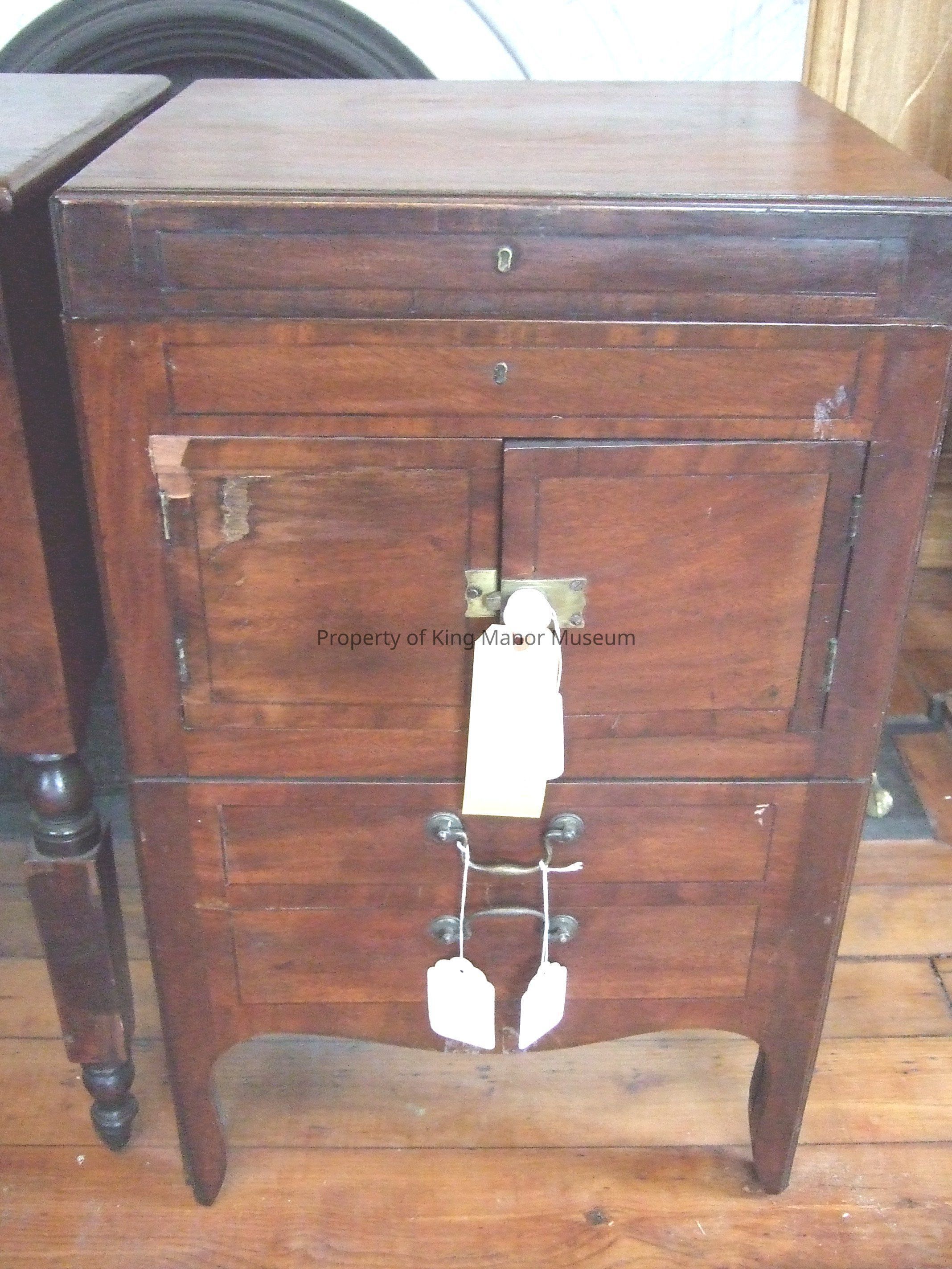 Cherry or mahogany veneered commode with hinge top to reveal 5 cut out circle [for basins]; a pair of latch doors on front, and a drawer at the bottom with a faux double drawer facade. Drawer pulls out to reveal a chamber. Moon shaped cut-outs on either side. Tag "KMA 5Q"Collection