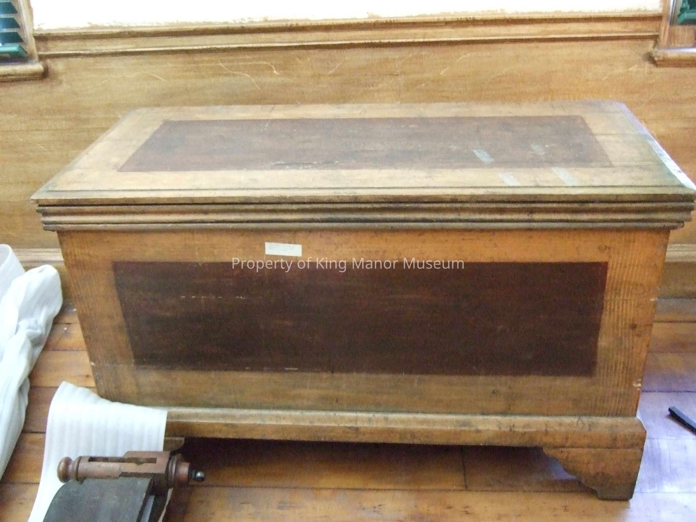 Refrigerator shaped like wood chest, decorated with wide painted borders, with hinged lid, on corner bracket feet Under lid affixed label "Mace's Diamond Refrigerator/patented October 24, 1876" with additional directions for use. Second hinged lid opens to tin-lined storage bin. Loose label in sleeve "Mace's Company"Collection