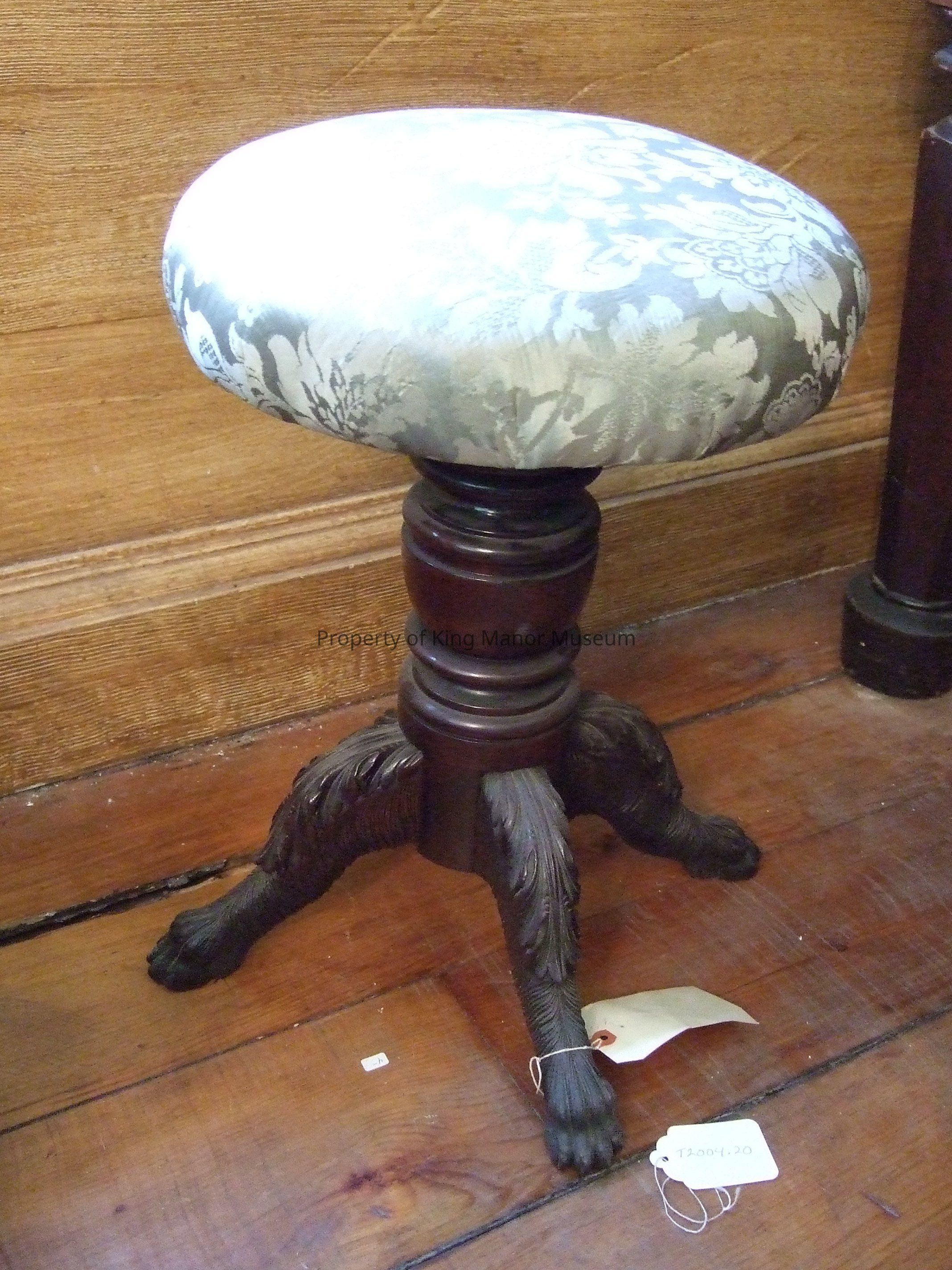 Upholstered piano stool, on baluster shaped support, and four carved acanthus and hairy paw feet. Partial remains of sticker tacked under seat, "Loaned by Miss Marie".Collection