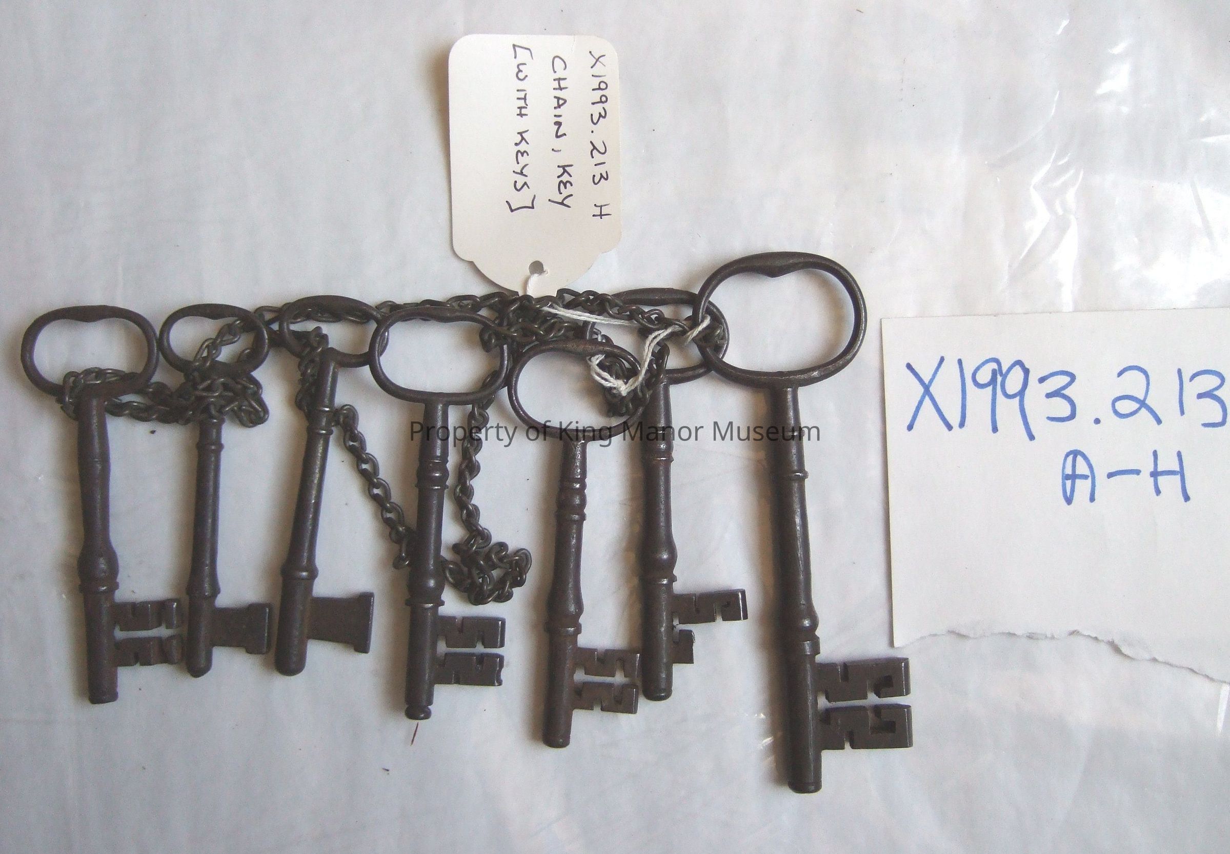 Brass, s-link chain with 7 iron skeleton keys of varying sizes; 5 having an open, geometric patterned "tooth", 2 having solid "tooth" design. Chain not original to keys.