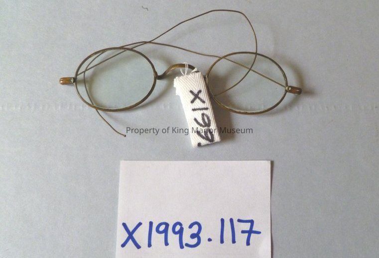 Wire-rimmed glasses with green-tinted glass and wire ear pieces.