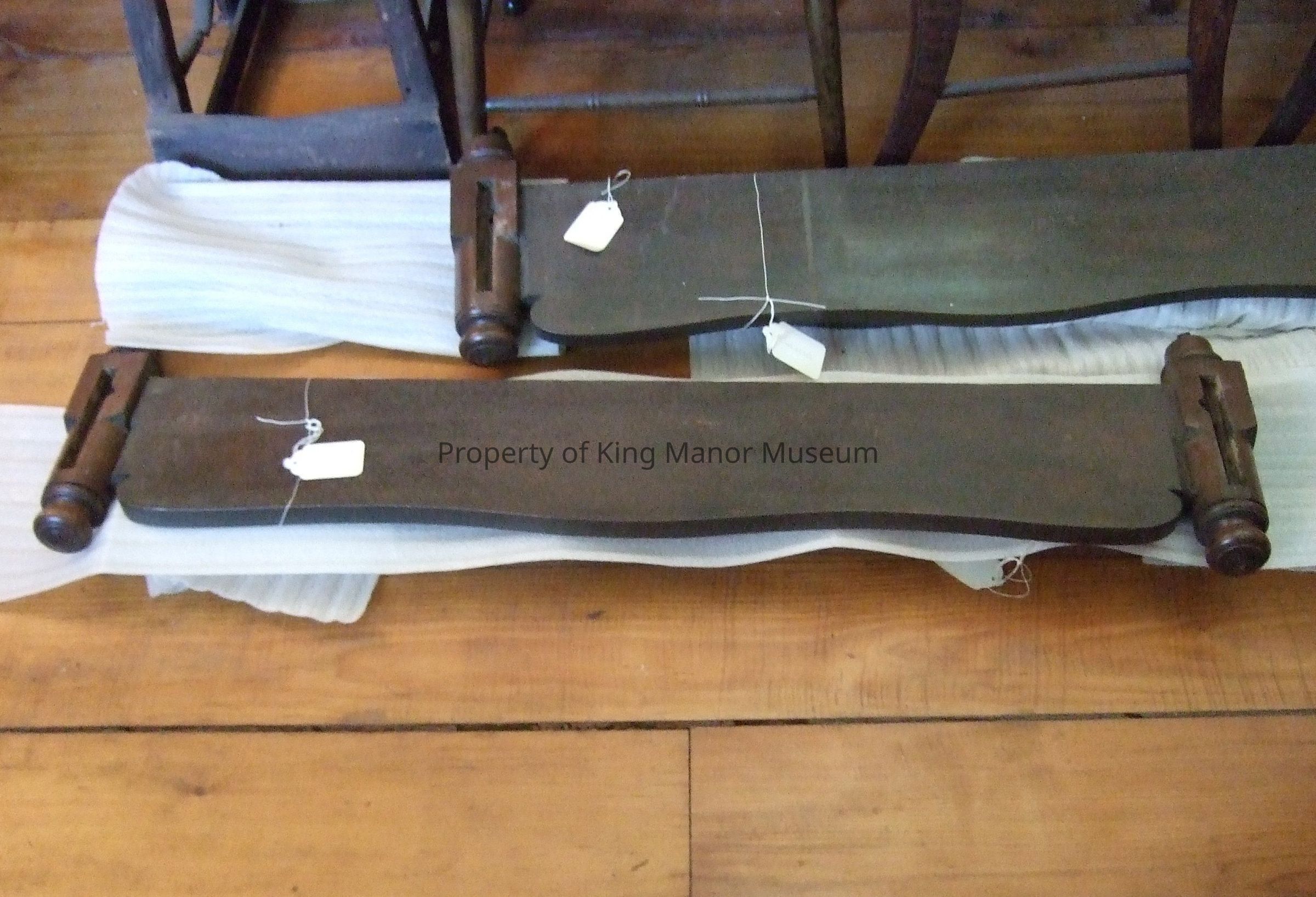 Wood (cherry?) bedstead, child's or trundle, stained brown with curved sides and turned ends. On casters.
