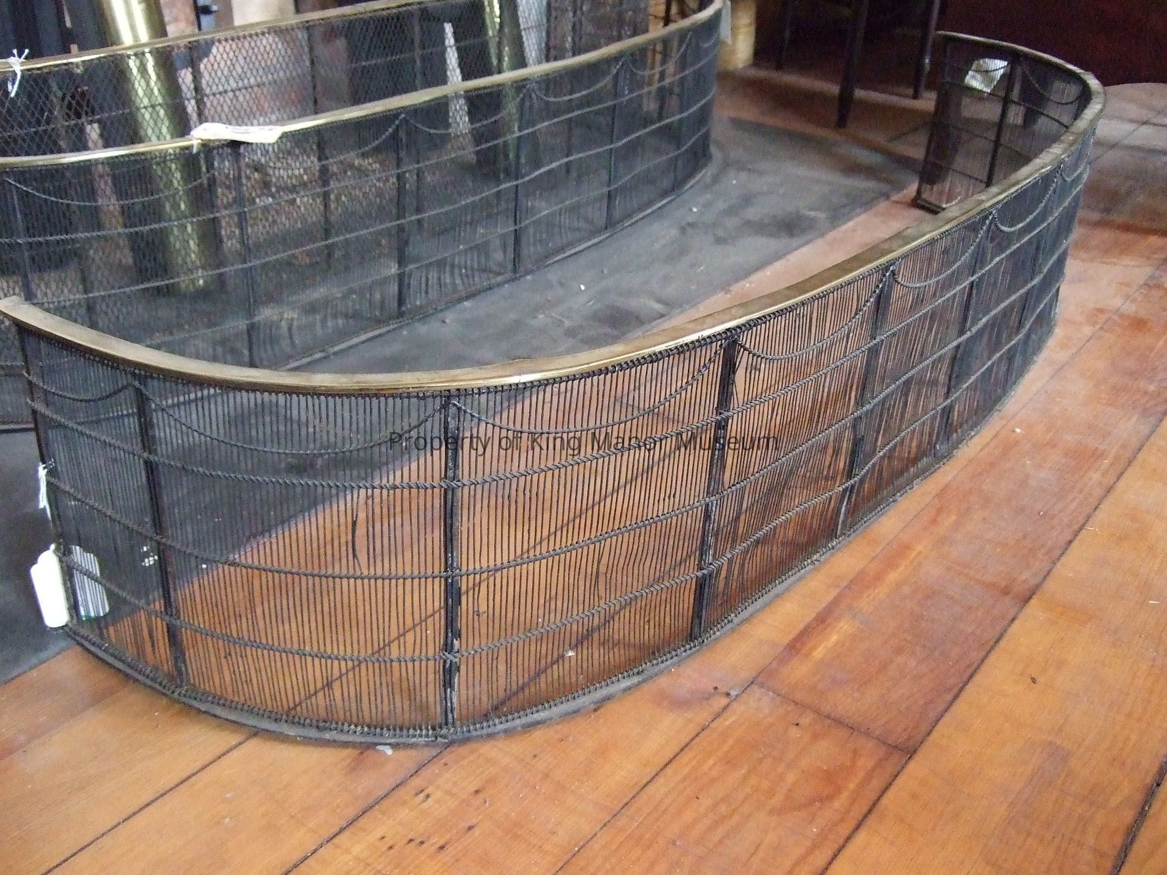 Elliptical shaped fender with brass edging along top edge and vertical iron wire screen, with horizontal wire near top in swag shape.Collection