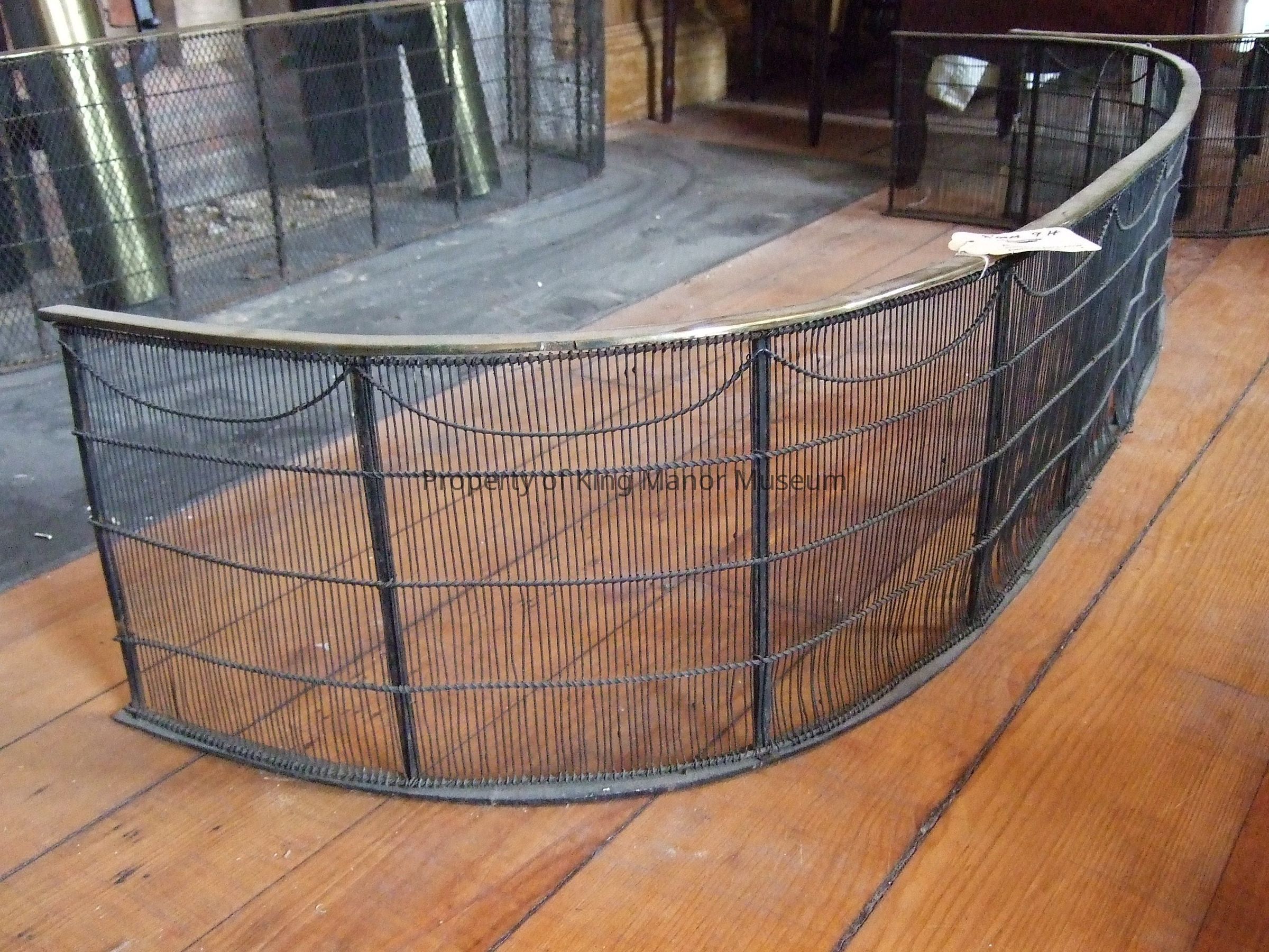Elliptical shaped fender with vertical iron wire screen, decorated by horizontal wire near top in swag pattern and brass edging along top. KMA tag "Room 9H"Collection