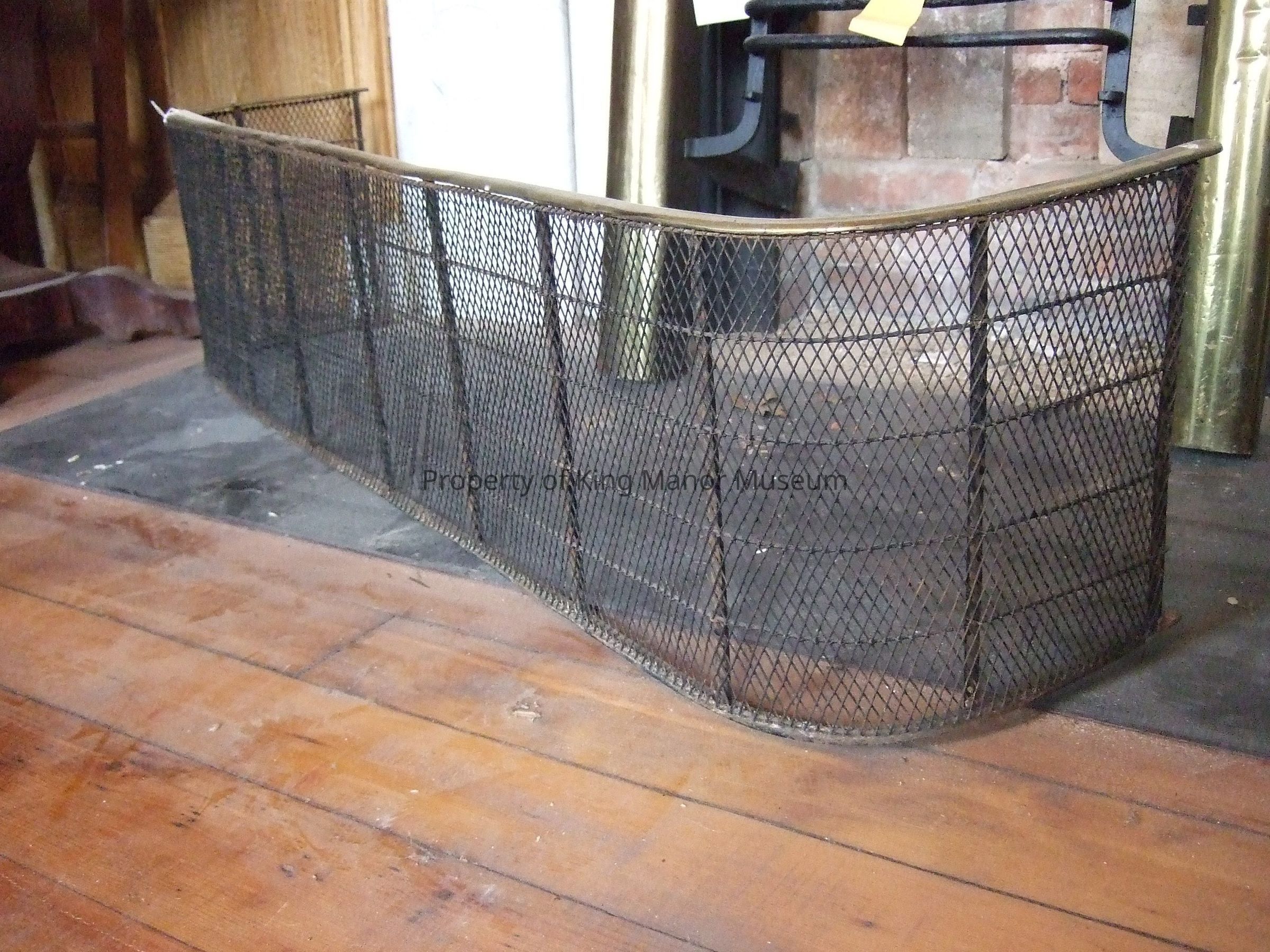 Fender having D-shaped corners, brass edging along top and cross-hatched wire screen.