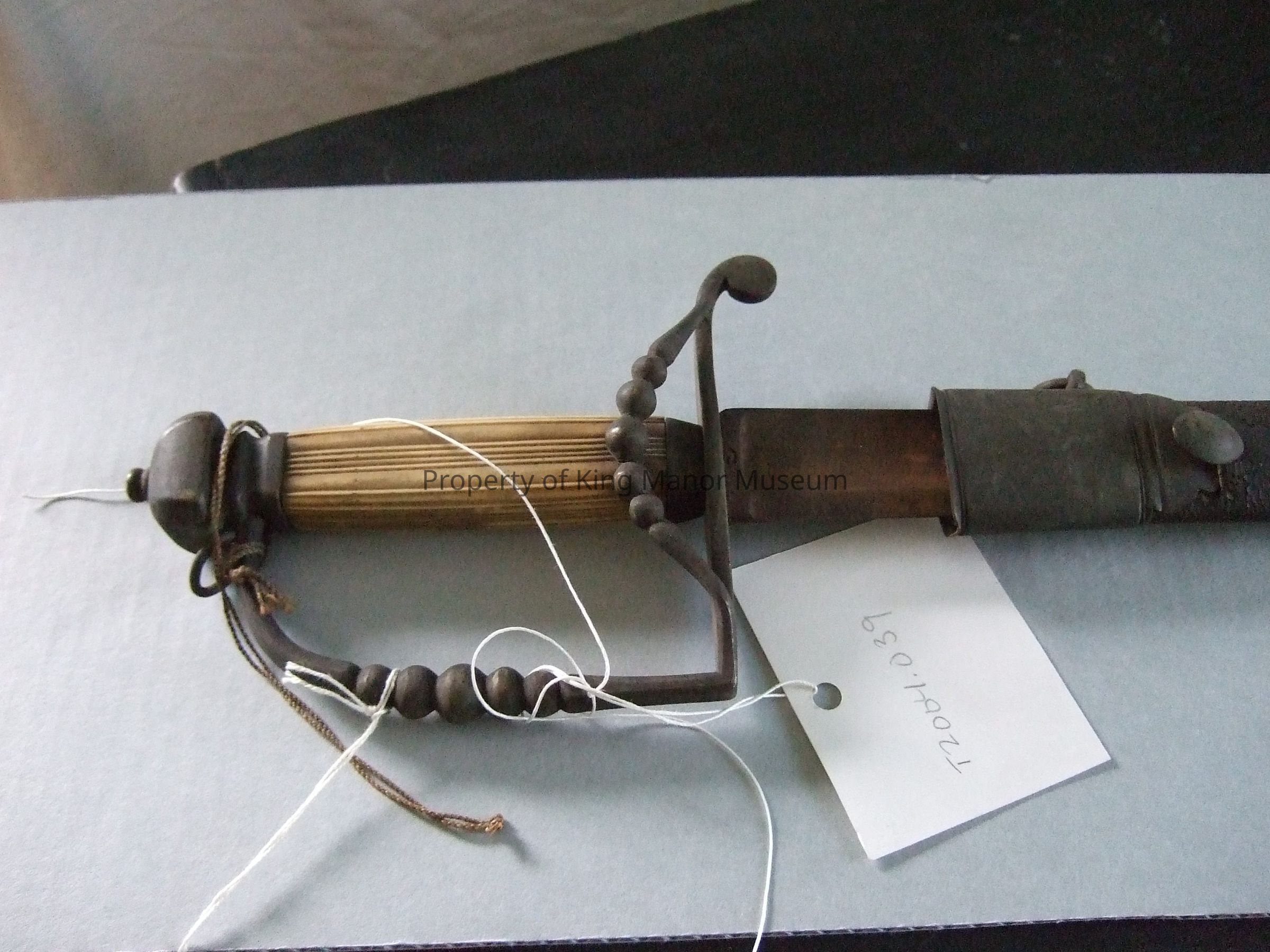 Ivory and brass handled sword with leather and brass sheath. The grip is ivory and the brass handle is embellished with graduated string-of-pearl motif at the top of the sword and at the side of the handle, and a square cushion shaped finial. The leather sheath has brass at the tip and at the top.Collection