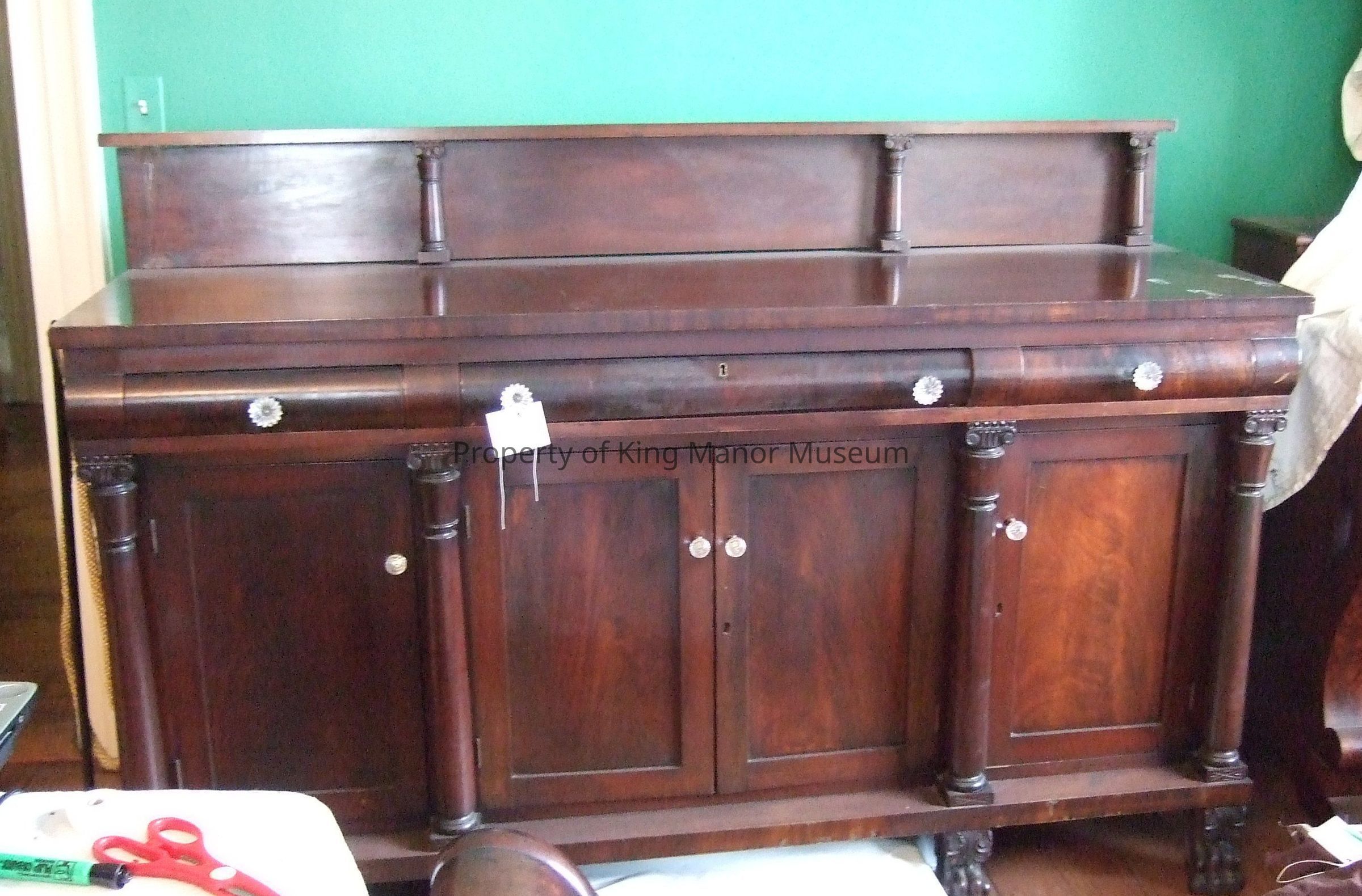 Stickers inside middle drawer and right drawer, both handwritten in ink, "Sideboard/ circa 1820/Loaned by Mrs. Clinton Bernard" KMA sticker inside right drawer.Collection