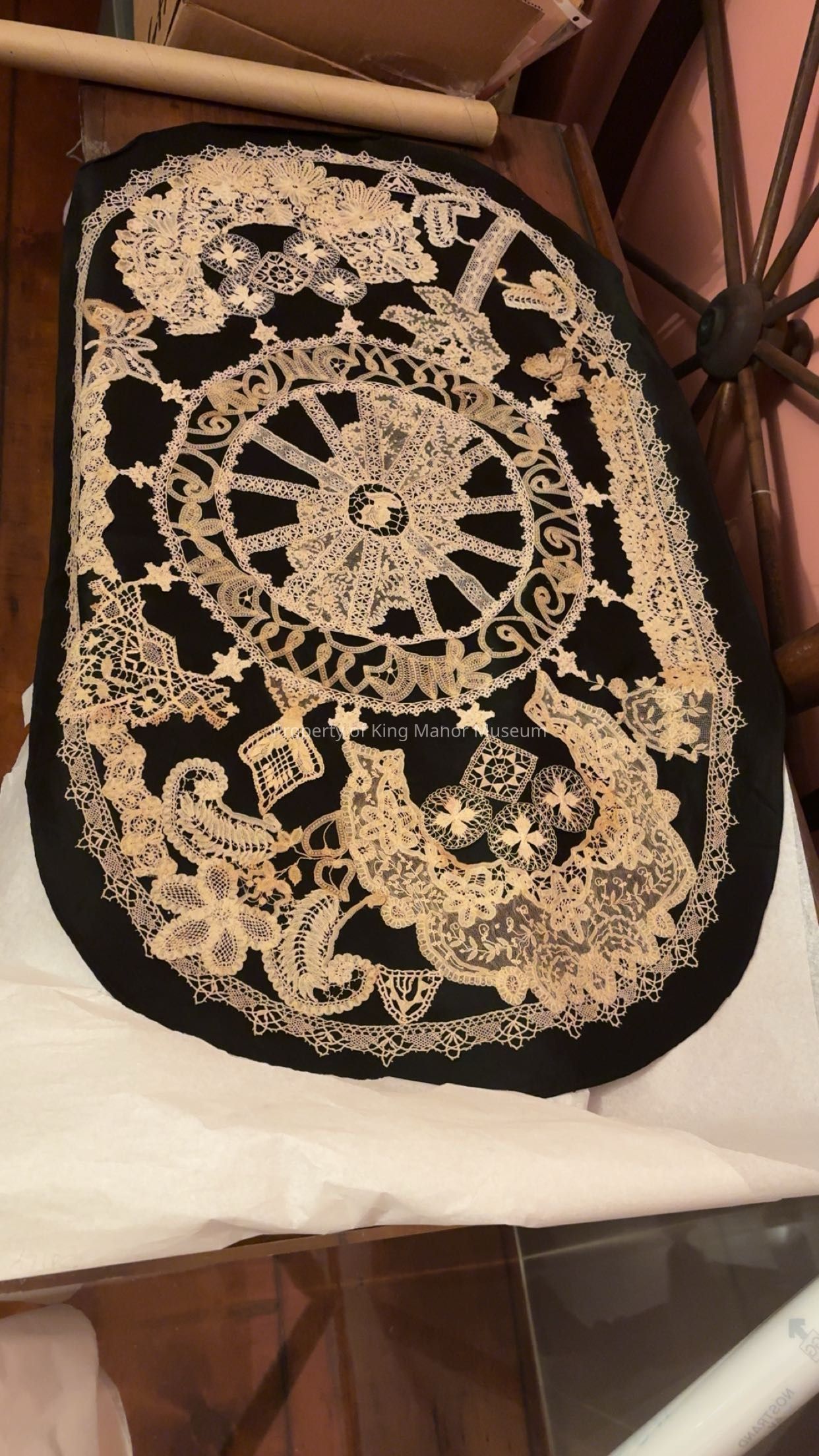 A variety of lace work sewed on a black cotton cloth, possible used as a table runner or bureau cover. Lace work features a center circle with a woman in a cap at the center, and two butterflies,Collection