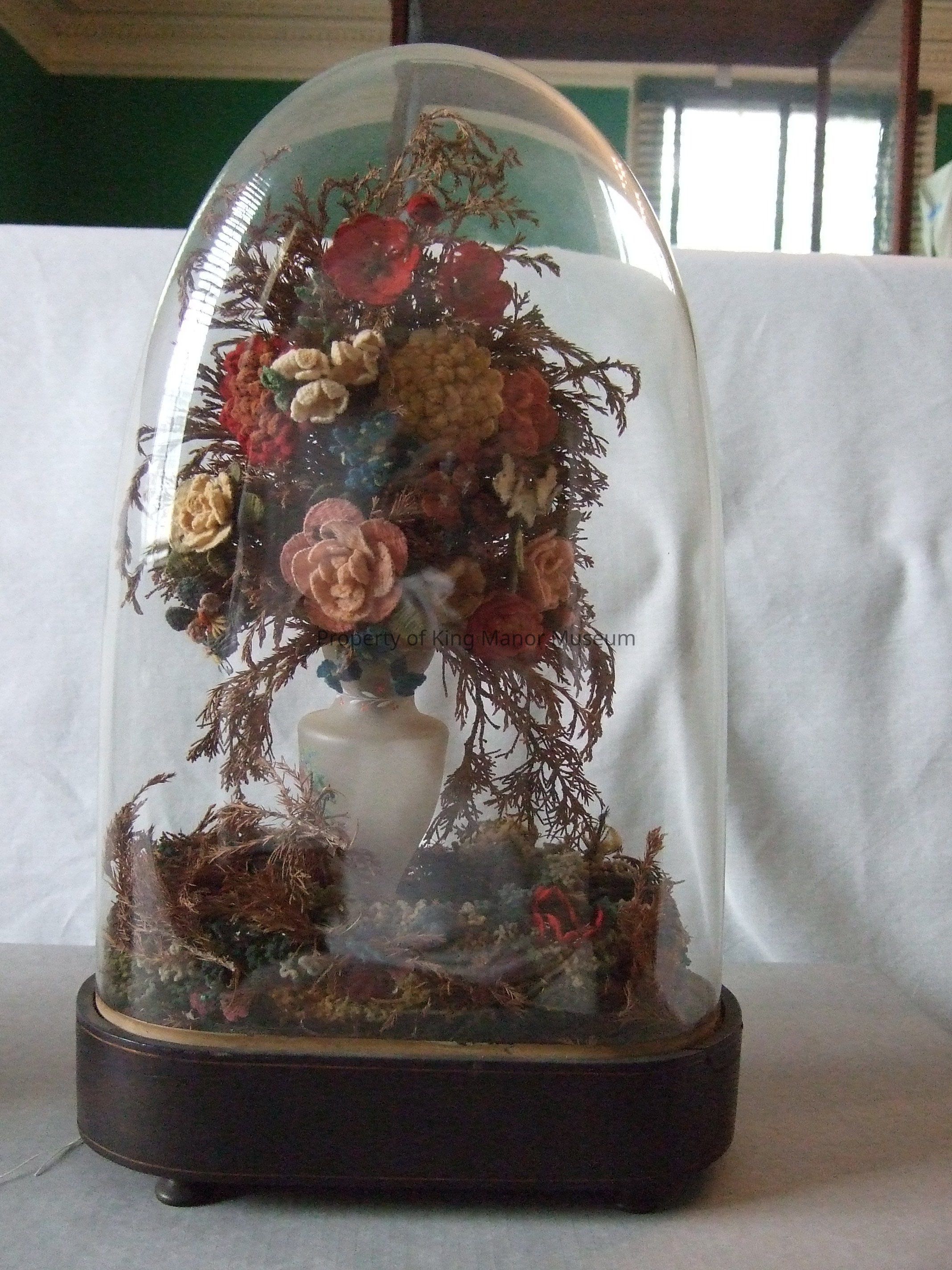 Glass vase adorned with enamel decoration of a vase of flowers, filled with an artificial flower arrangement of wool flowers, using red, blue, pink, green, brown and beige and dried evergreen branches. Set on wood base with four pad feet and covered by an oval clear glass dome.