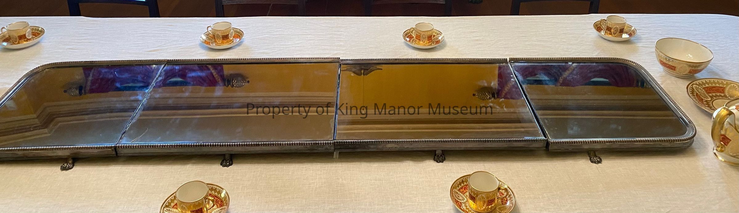 George III mirrored plateau, English circa 1830. In four parts, silverplate-framed having gadrooned border and supported on Lion's paw feet, marked underfoot "A CCCXXX11".Collection