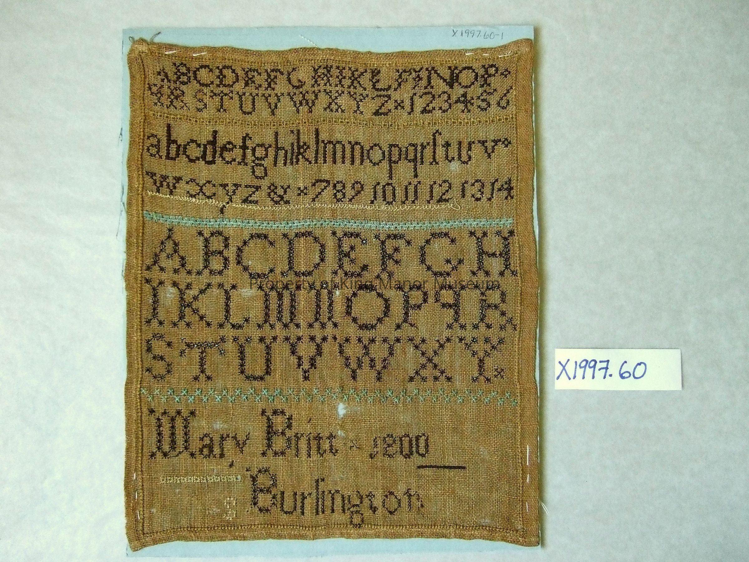 Sampler featuring the alphabet worked by Mary Britt 1800 Burlington, having frame of veneered wood having beveled surface and mitered cornersCollection