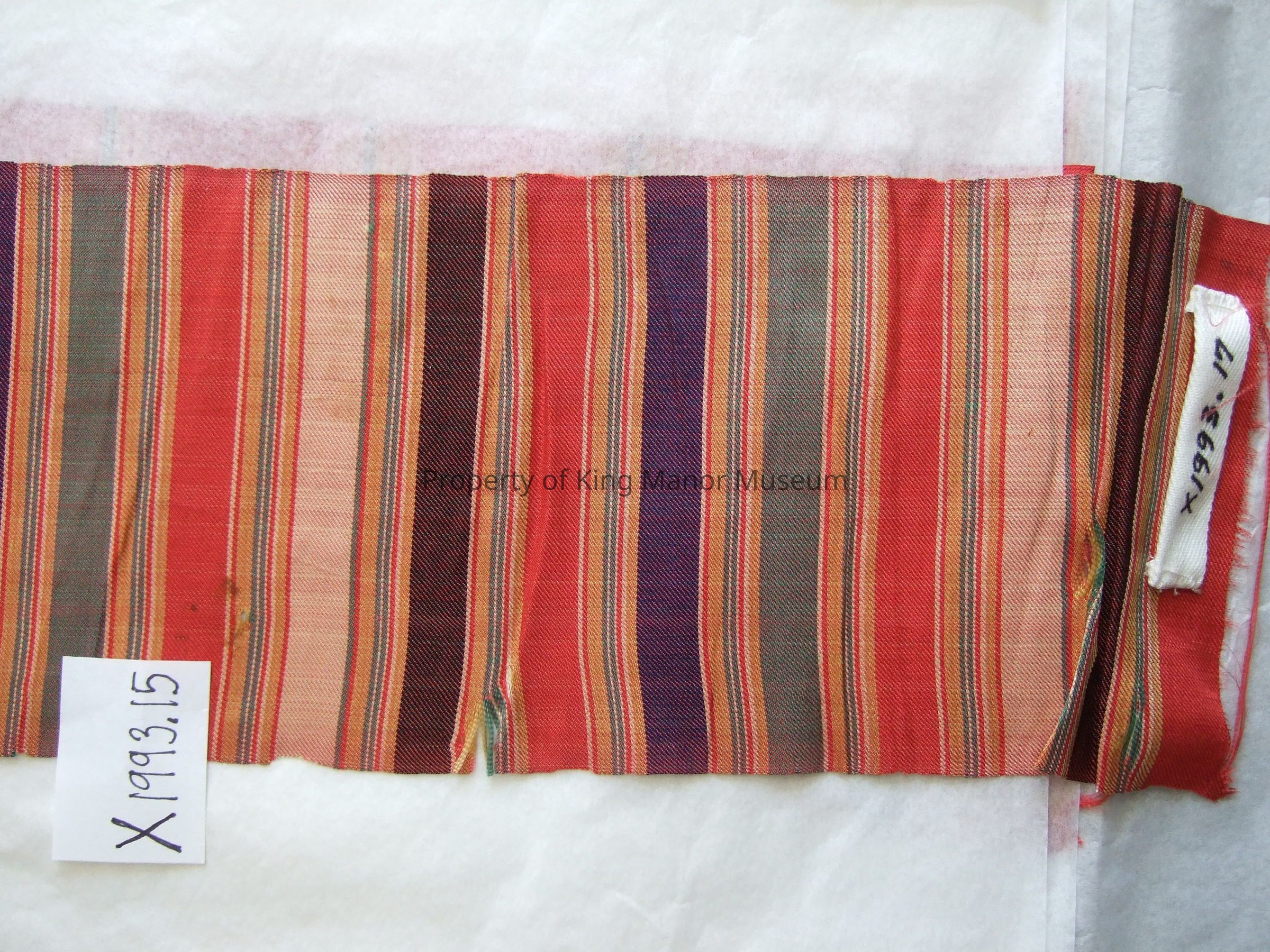 Hand woven silk sash of red, green, yellow and purple stripes.